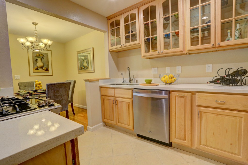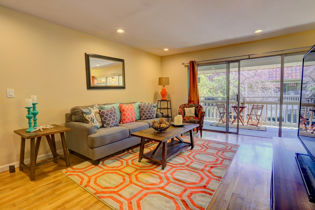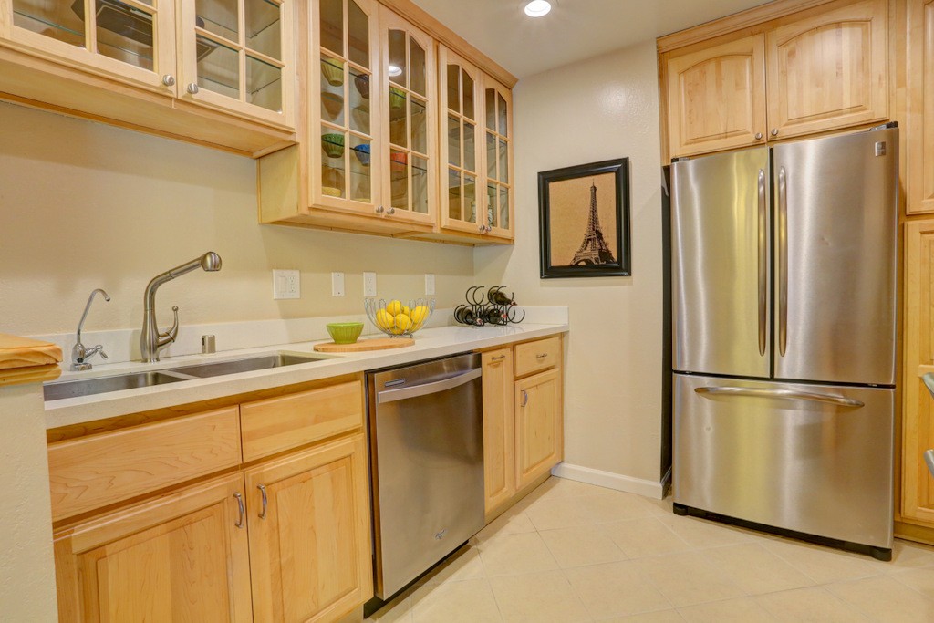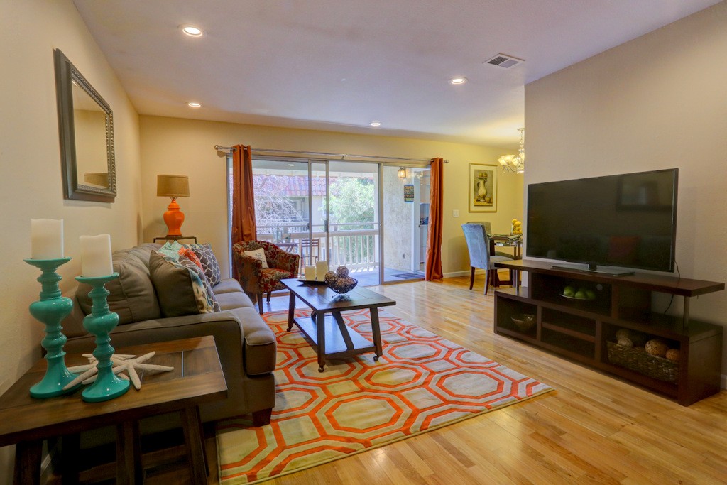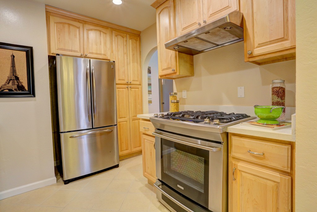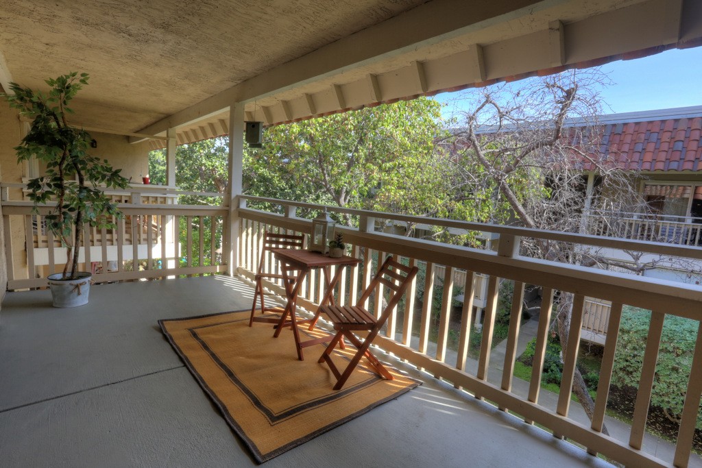 Desirable updated 2 beds 2 baths condo with 2 private balconies and spacious living room. Double pane windows throughout. In-unit laundry hookup. This stylish unit features a remodeled kitchen with quartz countertops, maple cabinets, tile floors, stainless steel appliances including gas range, refrigerator, and microwave hood vent. Remodeled bathrooms. Additional features include hardwood floors, closet organizer system, and recessed lighting in kitchen and living room. Extra storage by the assigned carport. Gas provided by PG&E.