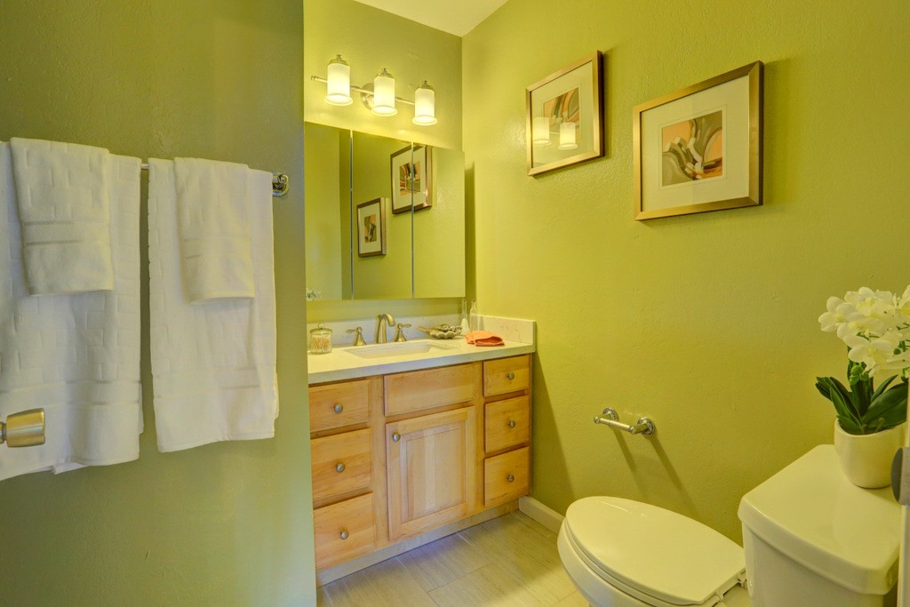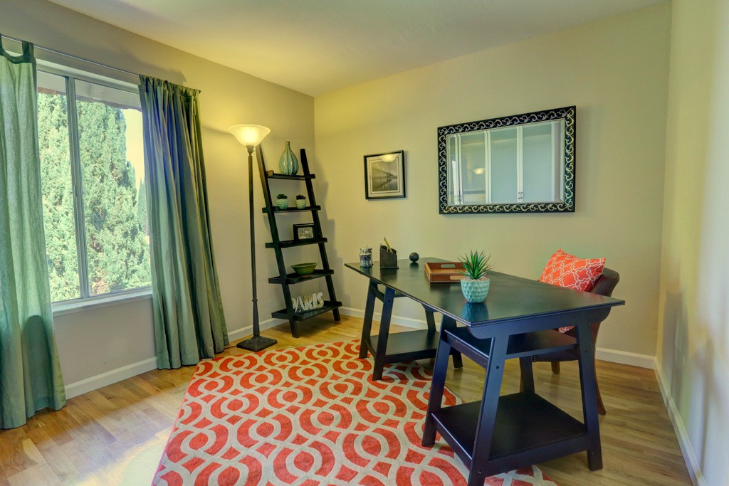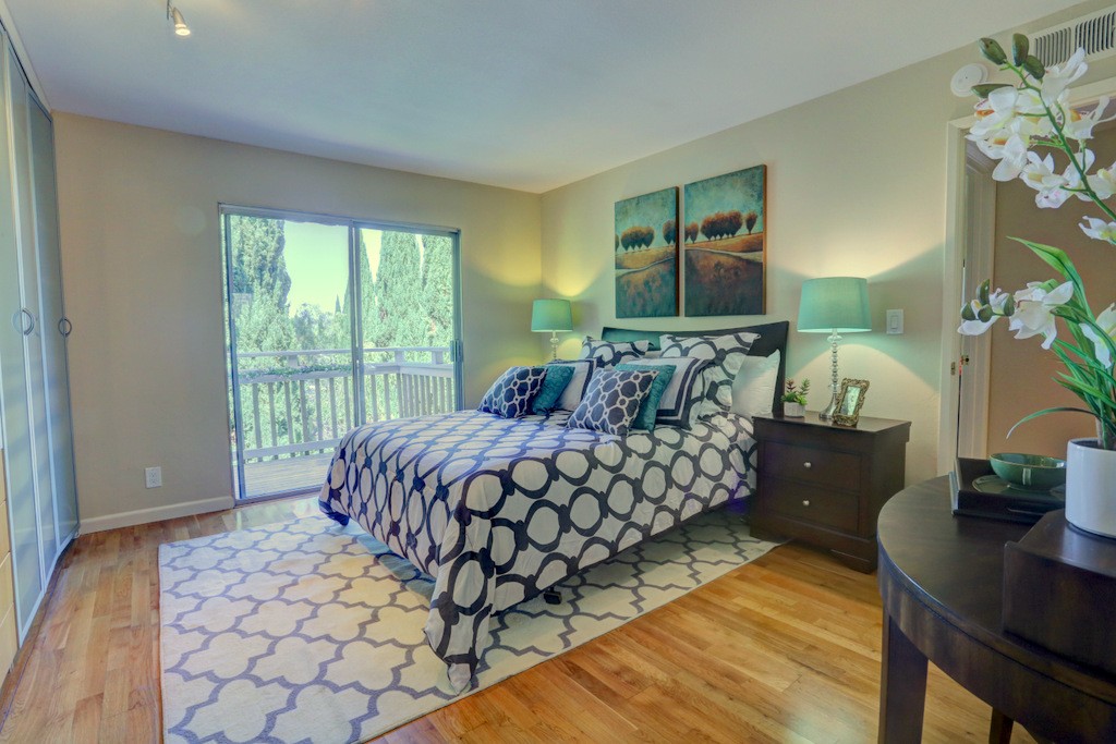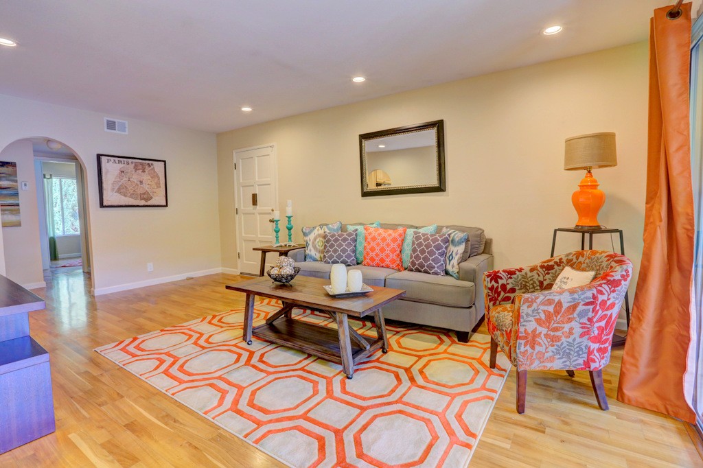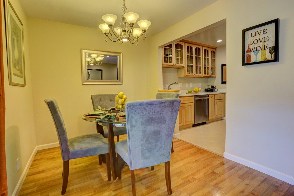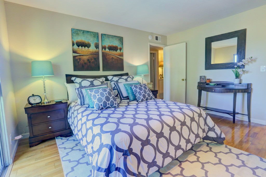 Desirable updated 2 beds 2 baths condo with 2 private balconies and spacious living room. Double pane windows throughout. In-unit laundry hookup. This stylish unit features a remodeled kitchen with quartz countertops, maple cabinets, tile floors, stainless steel appliances including gas range, refrigerator, and microwave hood vent. Remodeled bathrooms. Additional features include hardwood floors, closet organizer system, and recessed lighting in kitchen and living room. Extra storage by the assigned carport. Gas provided by PG&E.