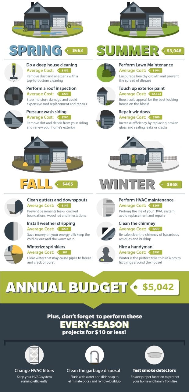 Here is a simple info-graphic to help you be mindful of home maintenance tasks. I think the yearly cost is a bit high. Some of these items you could stretch into once every two or three years. Also keep in mind to flush your water heater yearly to prolong its life, trim trees and bushes in the winter, and have a termite inspection every five years if you live in Santa Clara or a neighboring community.