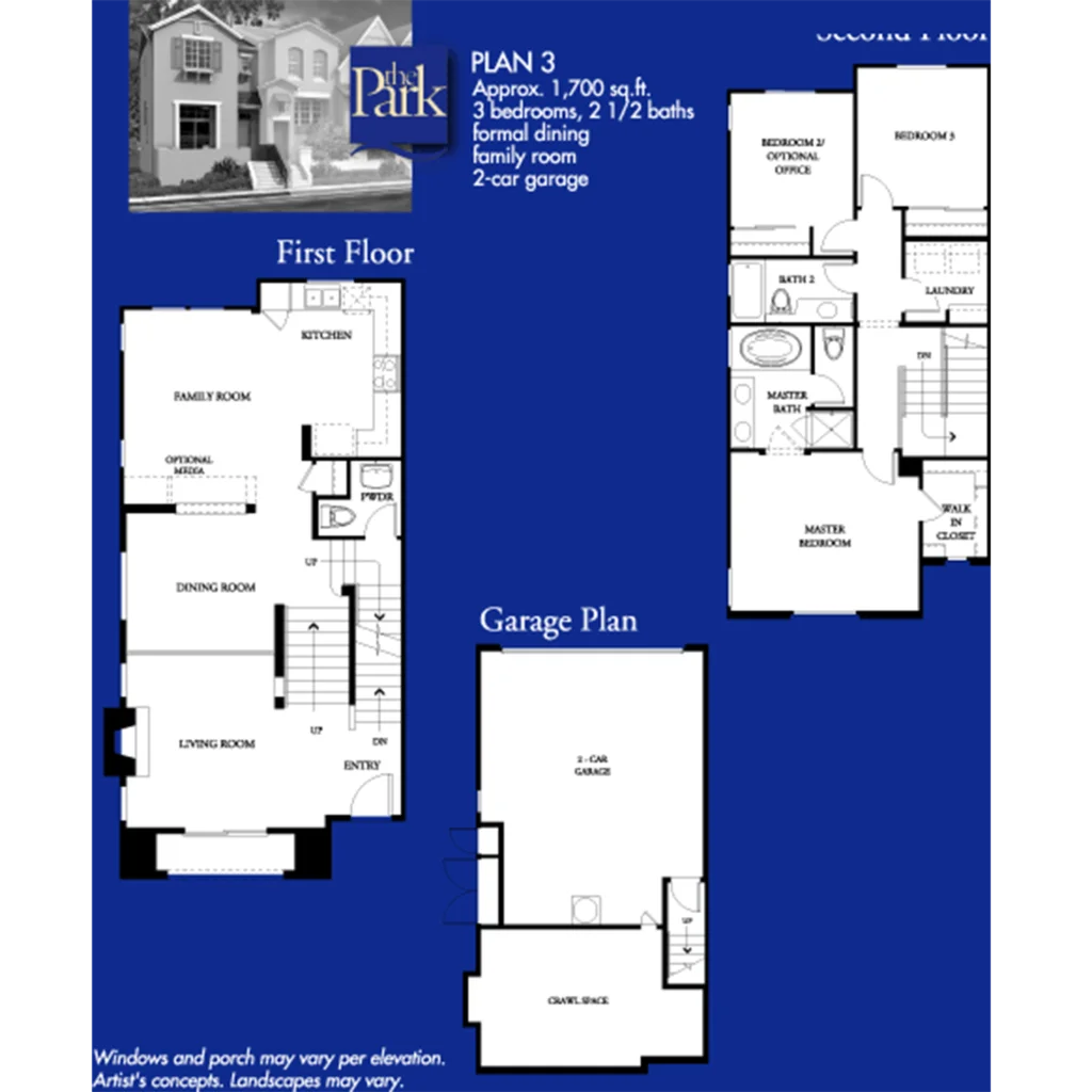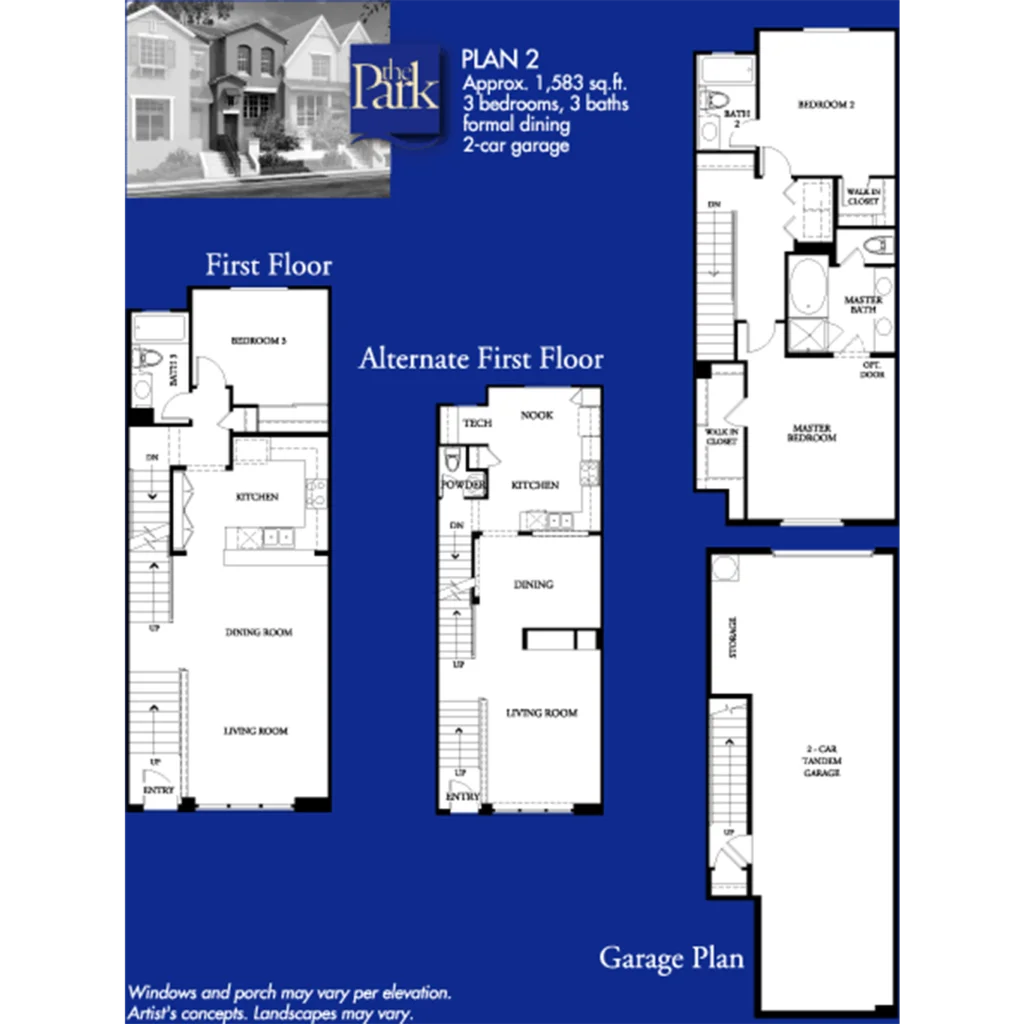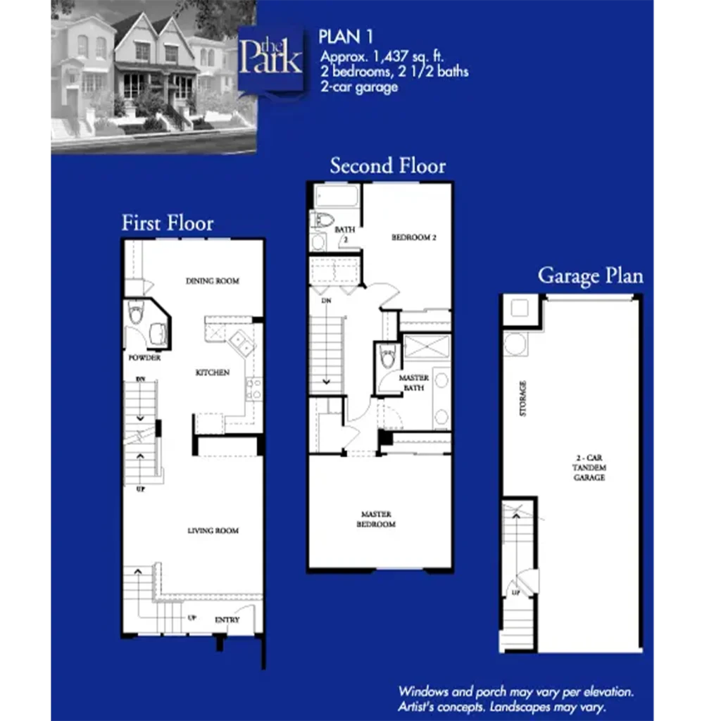The Park features 125 town homes with approximately 1400 to 1700 sq. ft., two or three bedrooms, and two and one-half or three baths, with architecture reminiscent of San Francisco style housing. Each walk-up house has a two-car garage.