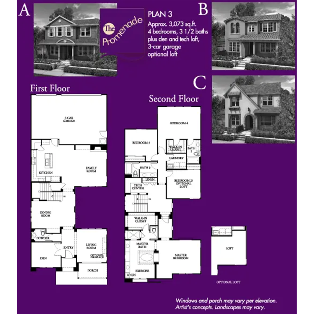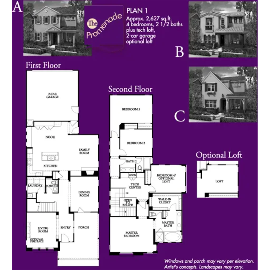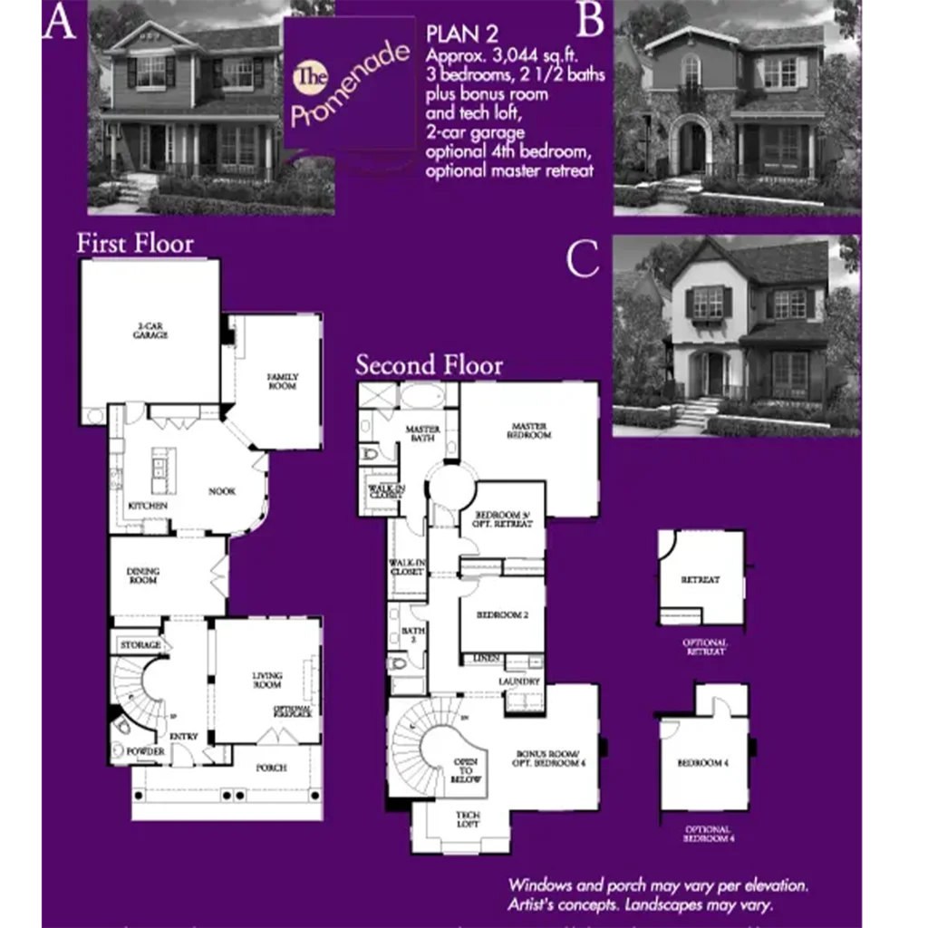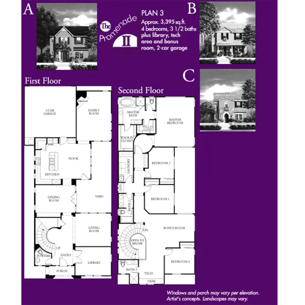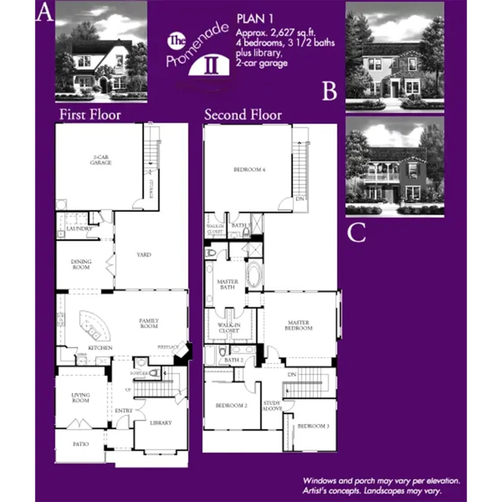 The Promenade II by Lennar Homes features luxurious floor plans ranging in size from 2,989 to 3,395 square feet and an eclectic blend of great historic-style architecture. These homes, which feature private courtyards, have four or five bedrooms, three and a half or four bathrooms, and two-car garages.