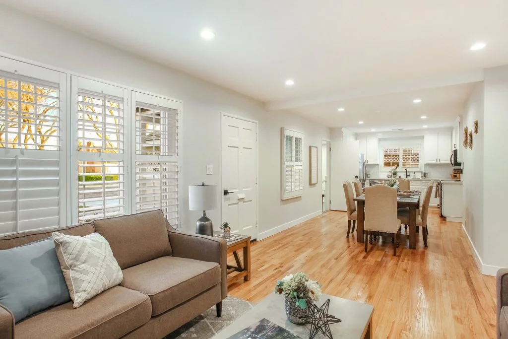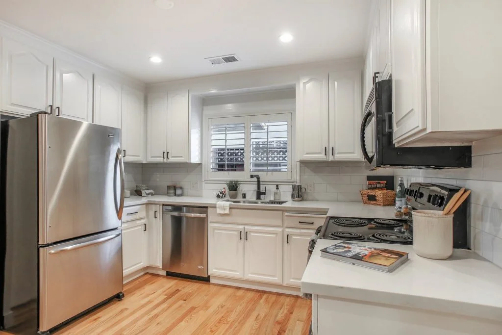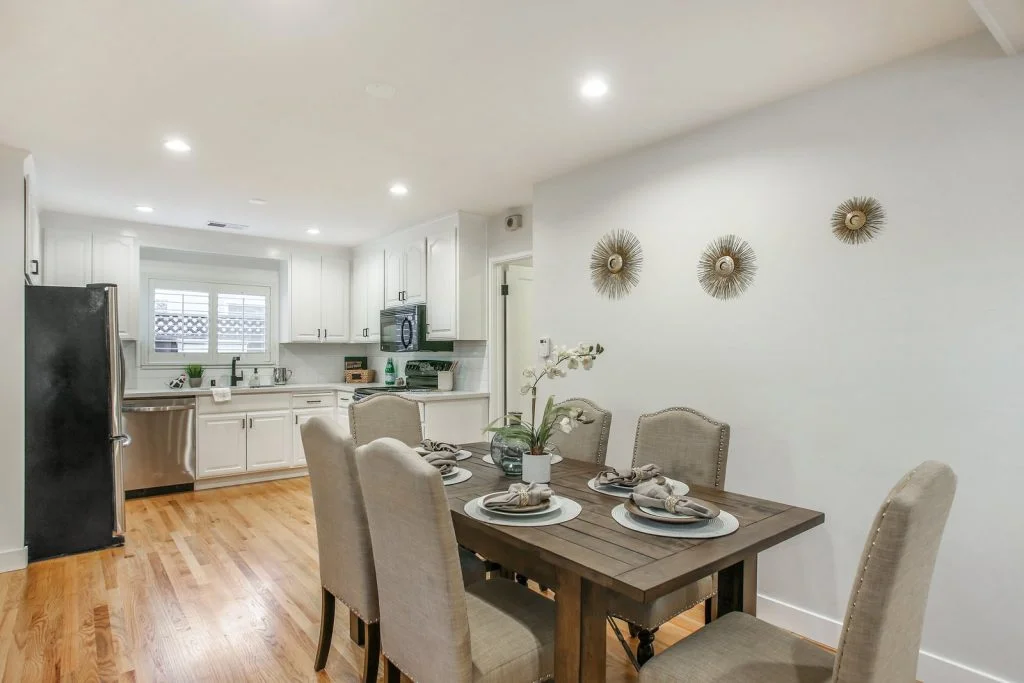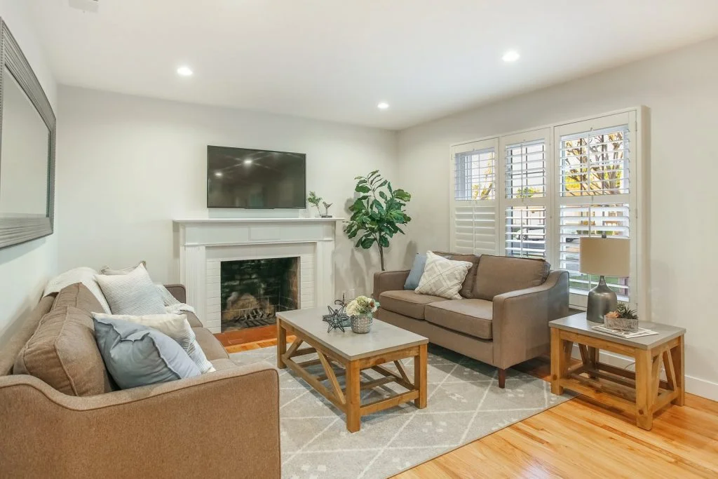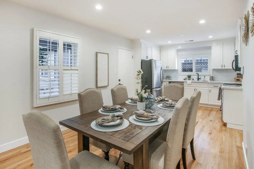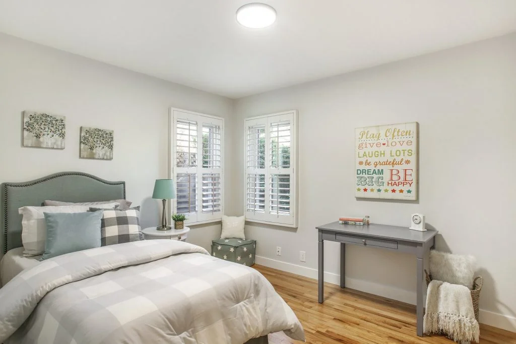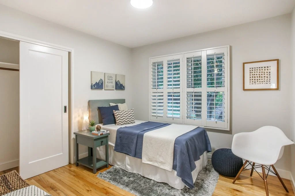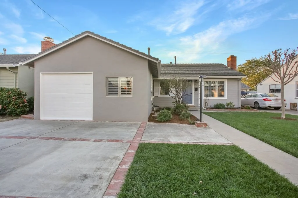 Open & bright Sunnybrae home in the heart of Santa Clara. This beautifully updated home is situated on a quiet street and features a spacious living & dining room that opens to the kitchen. Classic elements such as oak hardwood flooring, brick fireplace, traditional shaker style interior doors are combined with modern recessed lighting, contemporary hardware. The kitchen features refinished oak cabinetry with marble style quartz countertops, stainless steel under-mount sink, & stainless steel appliances. Bedrooms feature sliding door closets, hardwood flooring. The ensuite master is spacious, features dual closets, a private bath with large stall shower. Garage has been converted (no permits) to a spacious living area with high ceilings, recessed lighting & new plush carpeting. Additional features include dual pane windows, plantation-style shutters, spacious backyard with shed, metal roof, prolific orange tree & walking distance to popular stores, restaurants, parks & schools.