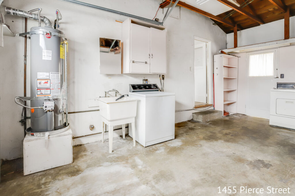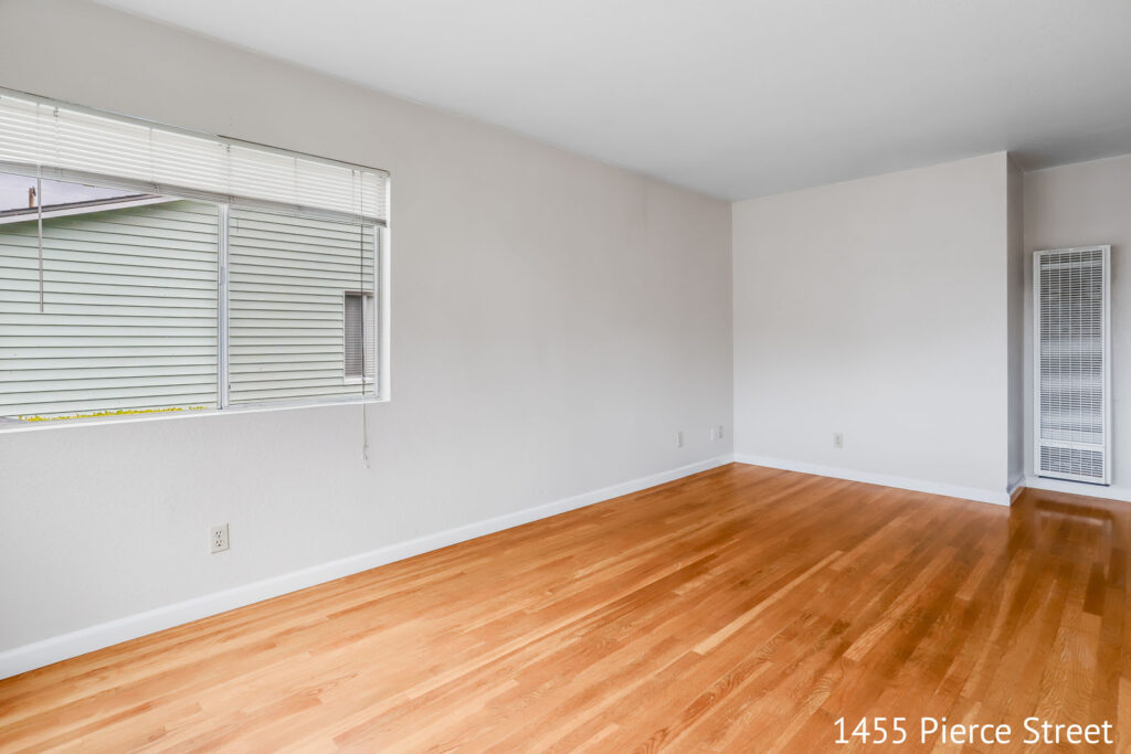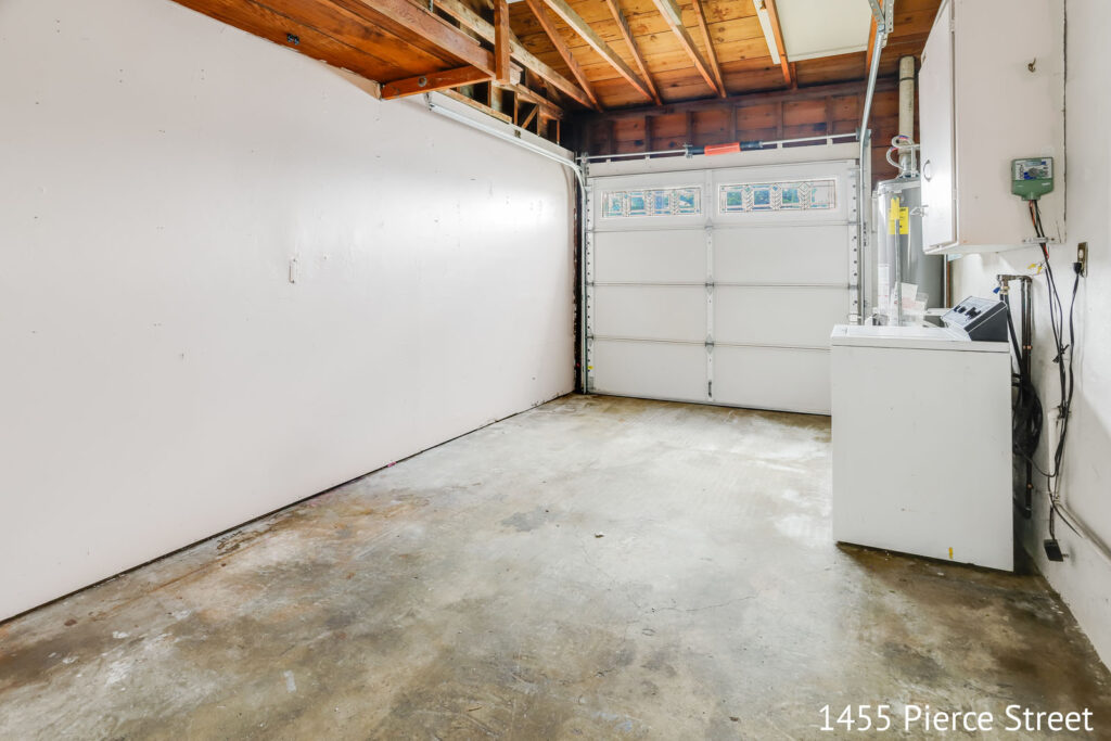 1455 Pierce St: – 585 sq ft. 1bd/1ba. 1 car garage with laundry area and kitchen access. Unit features hardwood floors, abundance of natural light, wall heaters, spacious bedroom and bathroom, eat-in kitchen and patio.