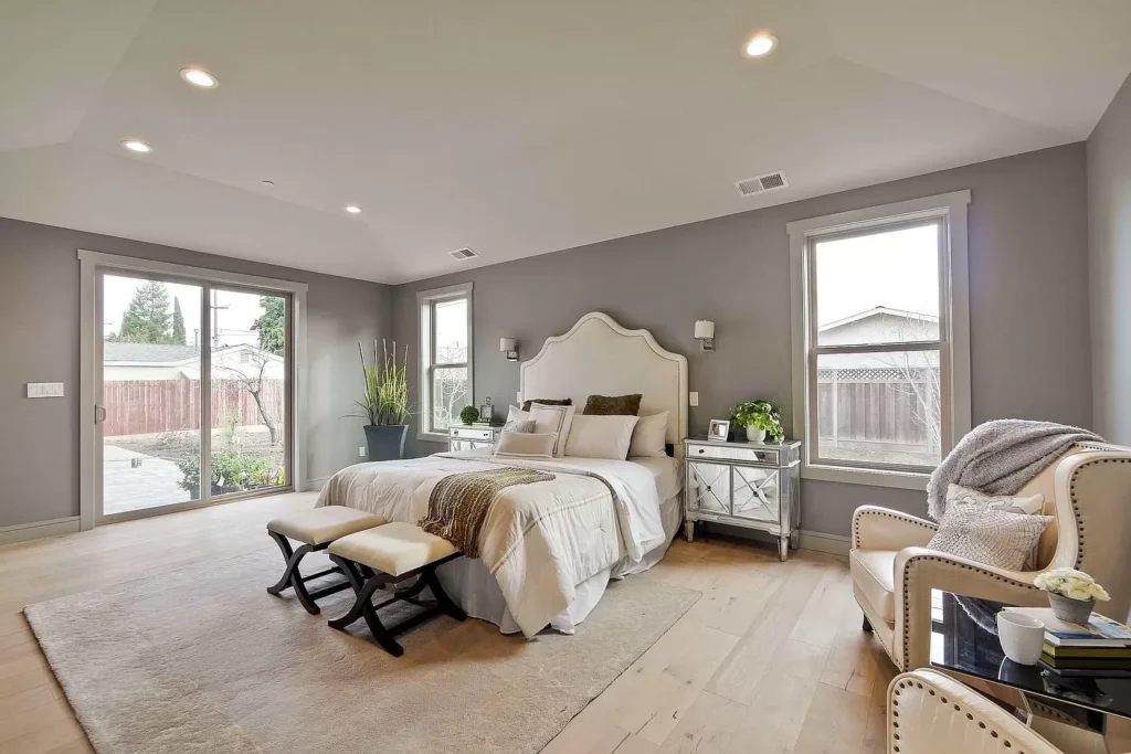 - Expansive primary bedroom retreat with coved ceiling, large walk-in closet, and private access to backyard