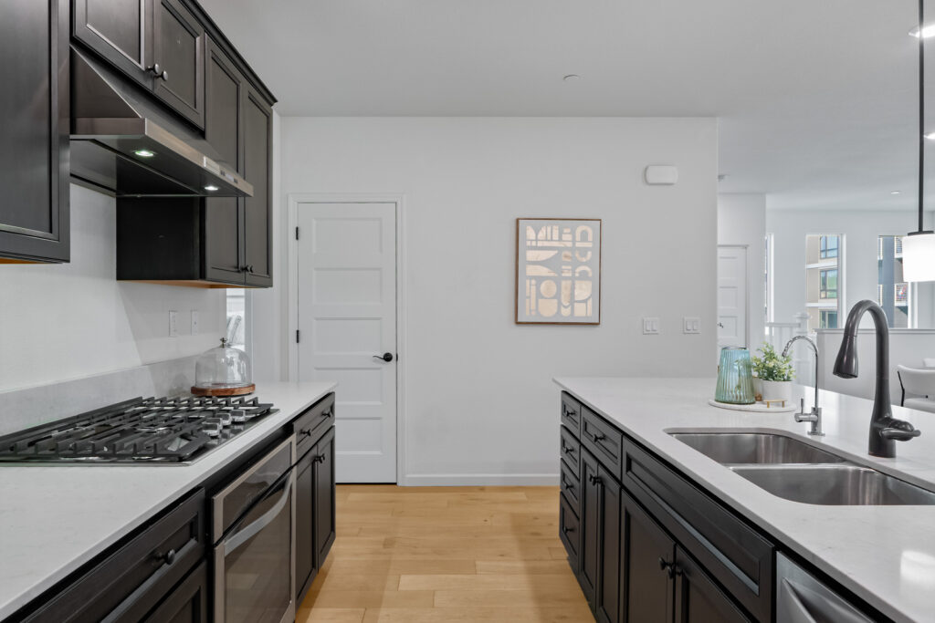 - Engineered hardwood in living area and kitchen