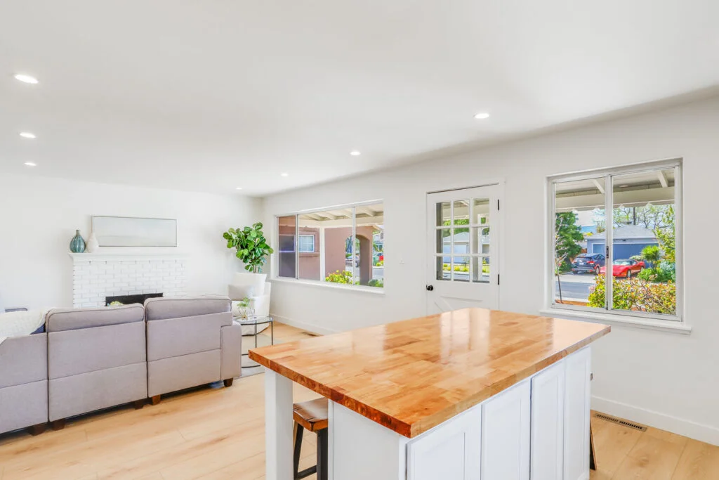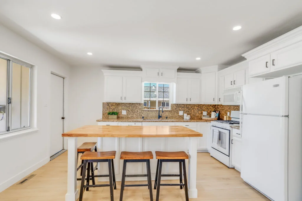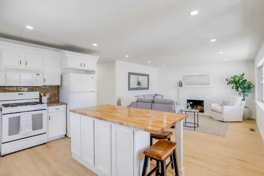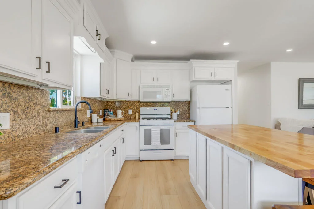 - Updated kitchen with granite countertops and oversize butcher block island with breakfast bar