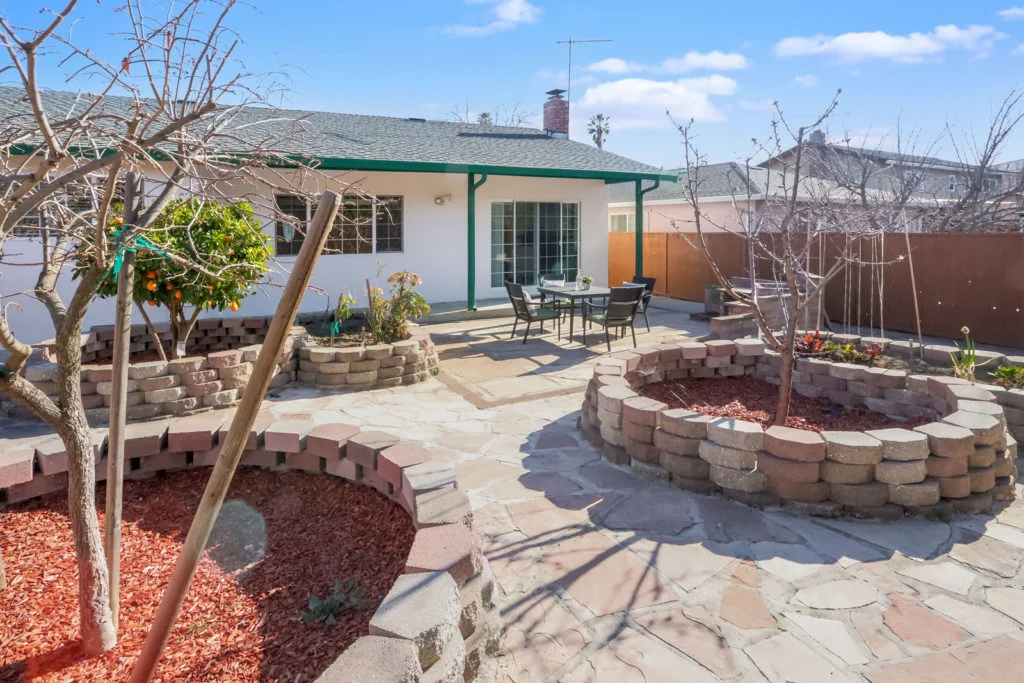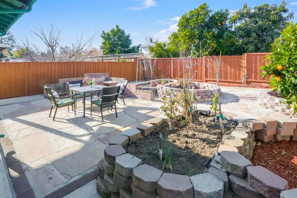 - Landscaped backyard with prolific fruit trees, built-in BBQ area, large patio area, and raised planters