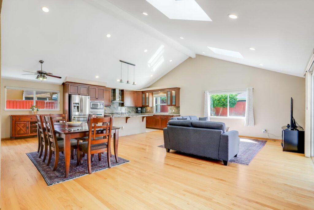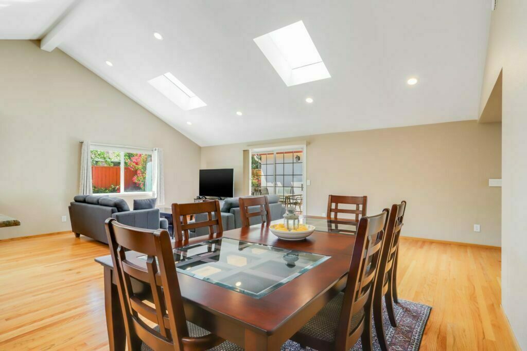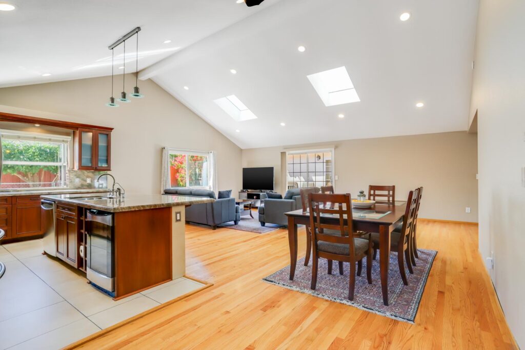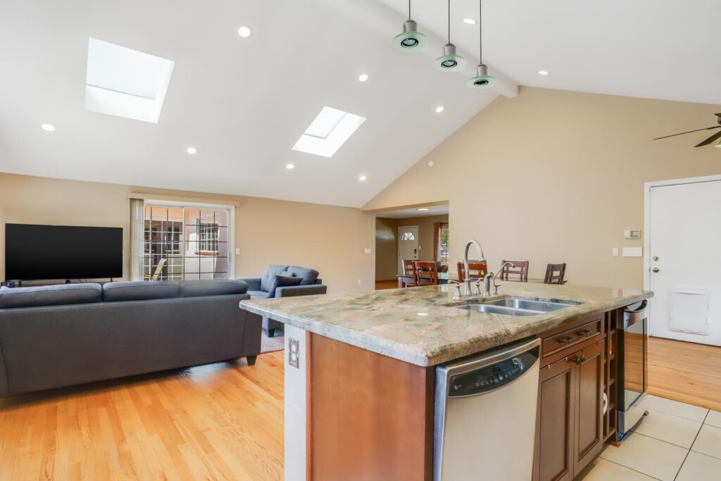 - Sunfilled great room with vaulted ceiling, two skylights, beautifully remodeled kitchen, spacious dining area, and living area overlooking the backyard