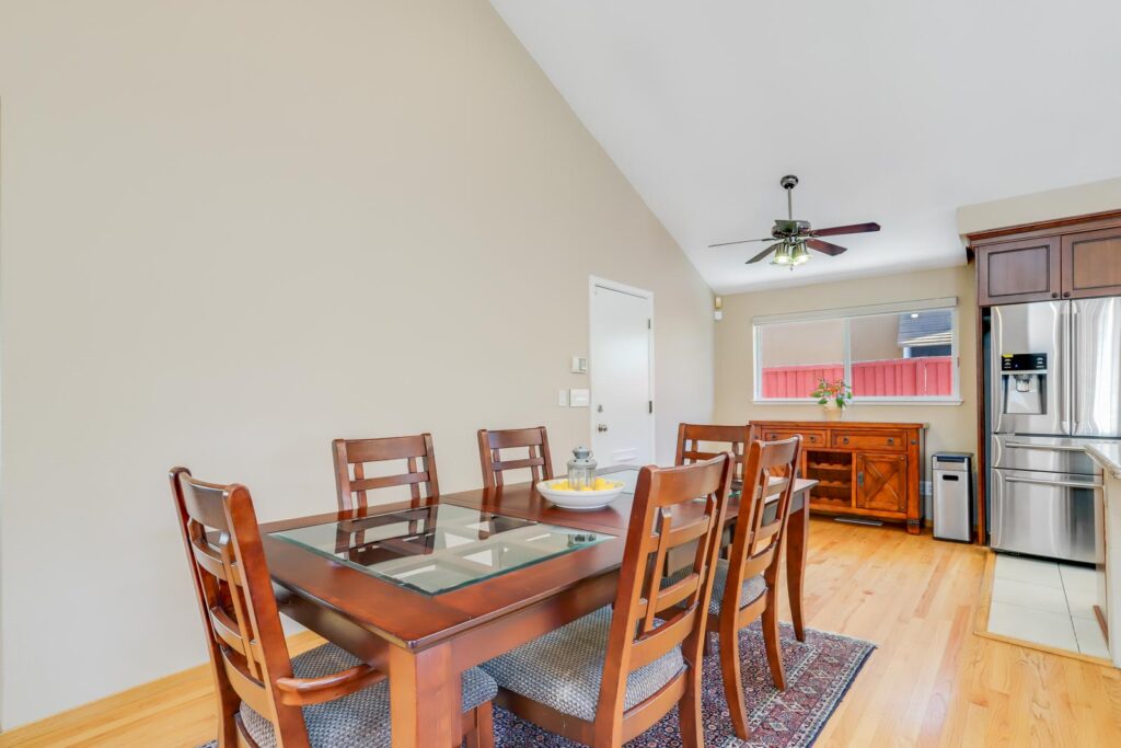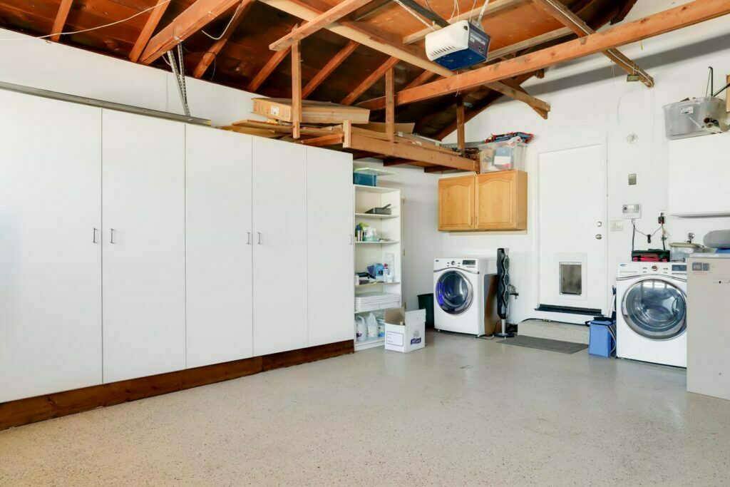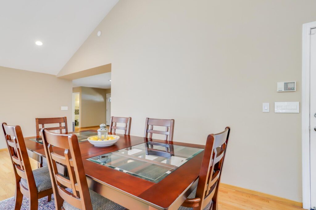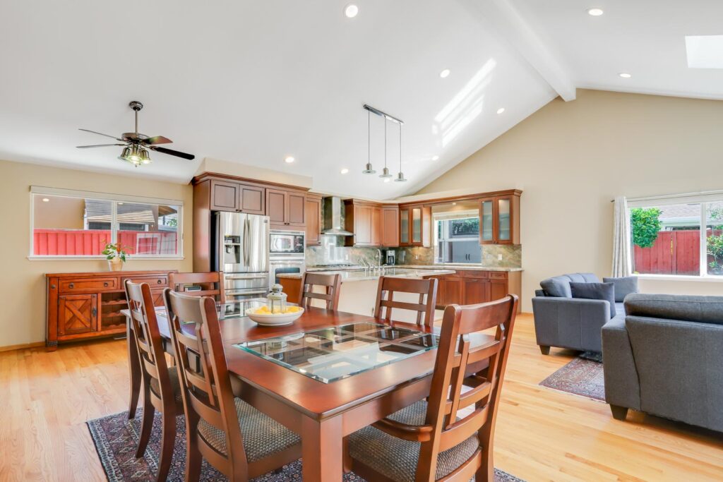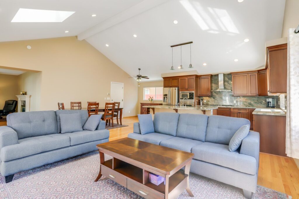 - Sunfilled great room with vaulted ceiling, two skylights, beautifully remodeled kitchen, spacious dining area, and living area overlooking the backyard