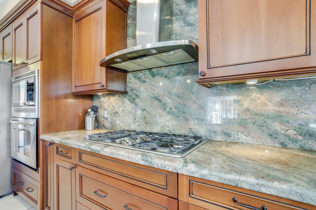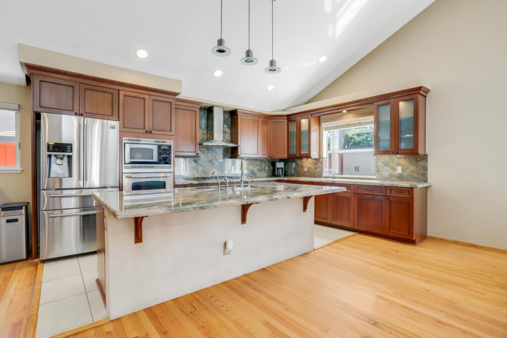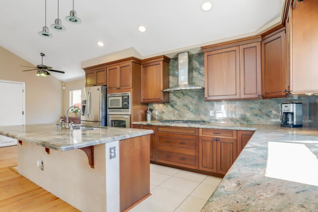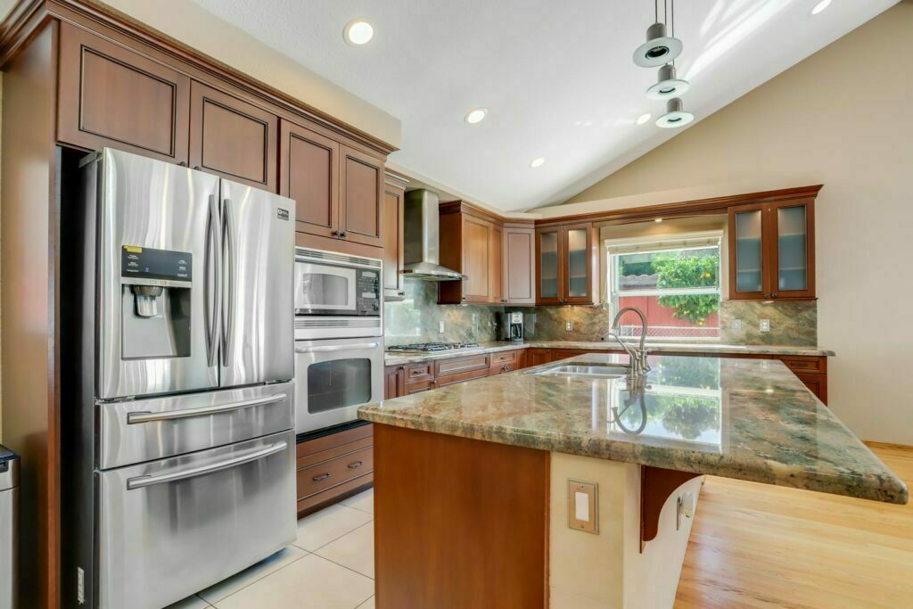 - The updated kitchen is complete with gorgeous cabinets, stainless steel appliances, granite countertops tile flooring, a large garden window, and a huge island with a sink, wine fridge, and breakfast bar