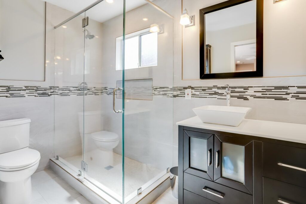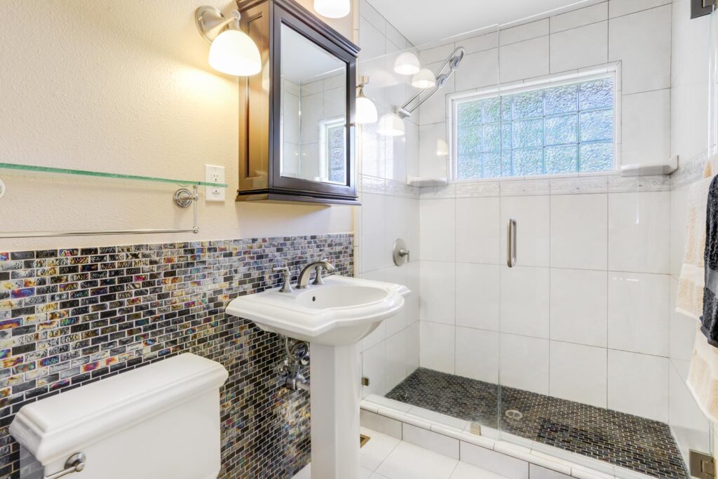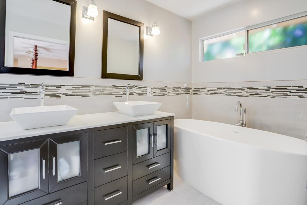 - Sunfilled primary retreat with private entrance to the backyard deck and spa-like ensuite with freestanding tub, dual sink vanity, and large stall shower with frameless enclosure
