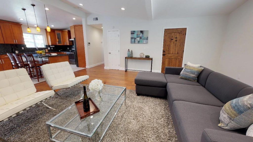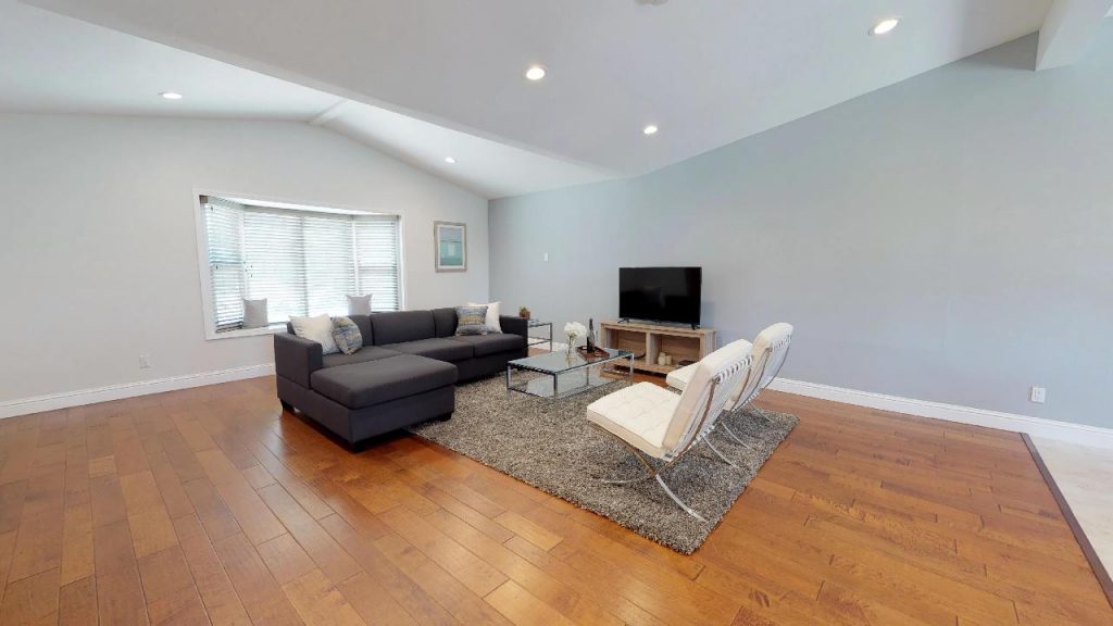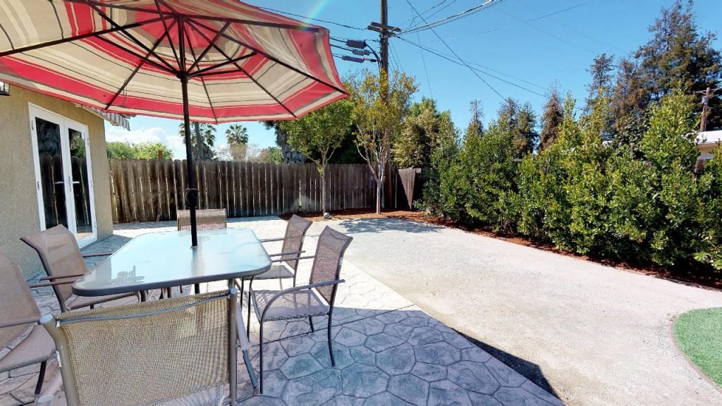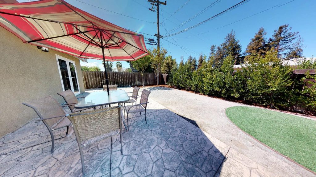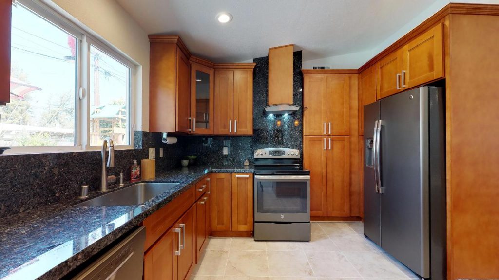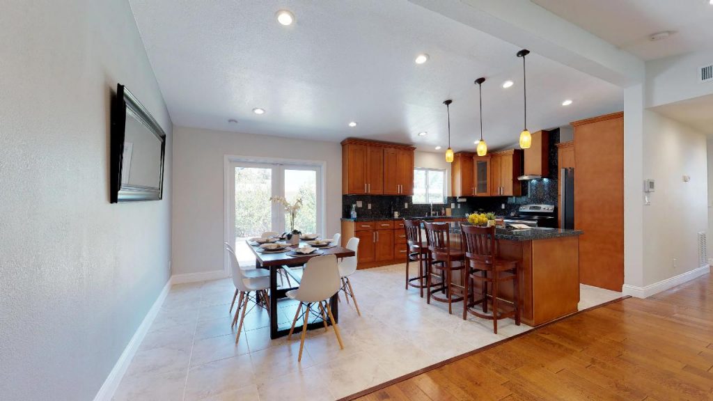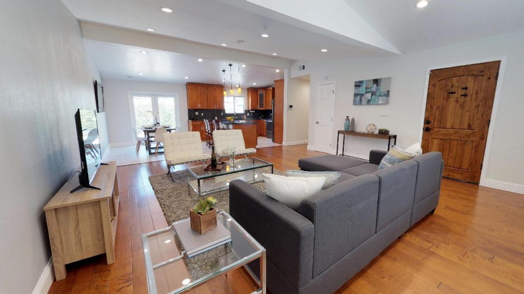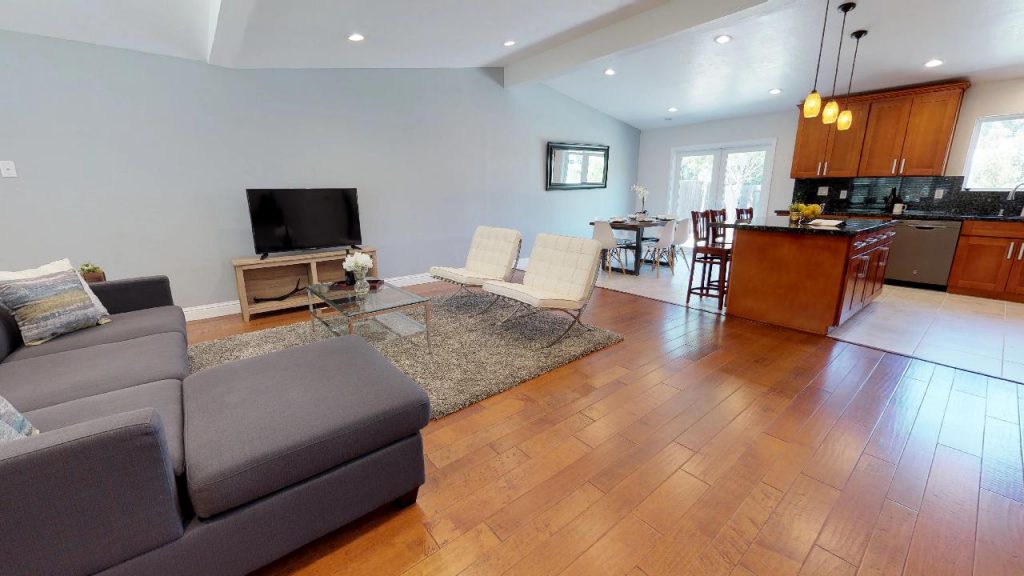 Remodeled in 2015, this beautiful, contemporary home features an expansive great room with dramatic vaulted ceilings open to a large island kitchen. The living room is spacious and features a bay window and recessed LED lighting. A large island kitchen with ample cabinetry, over island drop down pendant and LED recessed lighting, Blue Pearl granite slab countertops, under-mount stainless steel sink, breakfast bar, and stainless steel appliances. Master bedroom suite features a beautiful ensuite bath with dual vanity, walk-in closet with organizers, spacious stall shower with frameless glass enclosure, modern fixtures, hardware, and lighting. Other features include tankless water heater, rustic hand-scraped hardwood flooring throughout, updated insulation, new electrical, new plumbing, children’s play structure, artificial turf, patio with retractable awning, automatic drip irrigation, dual pane windows and french doors, finished 2 car garage with roll-up door and automatic opener.