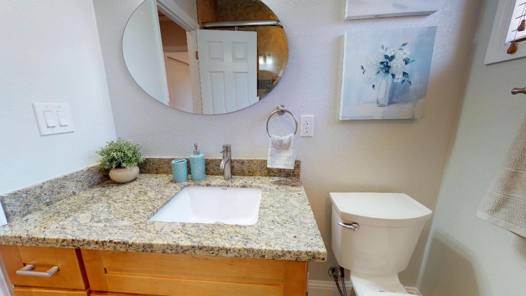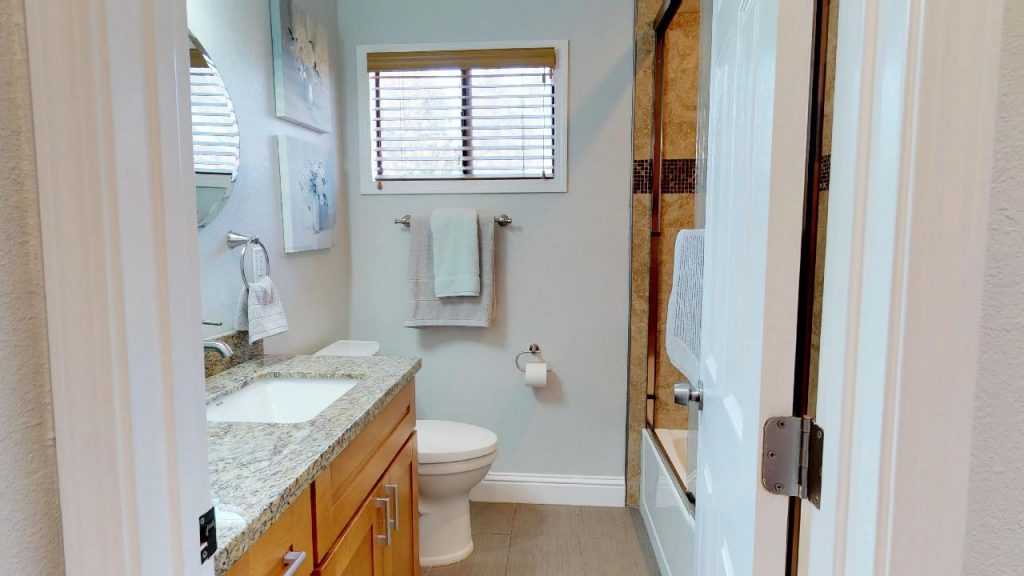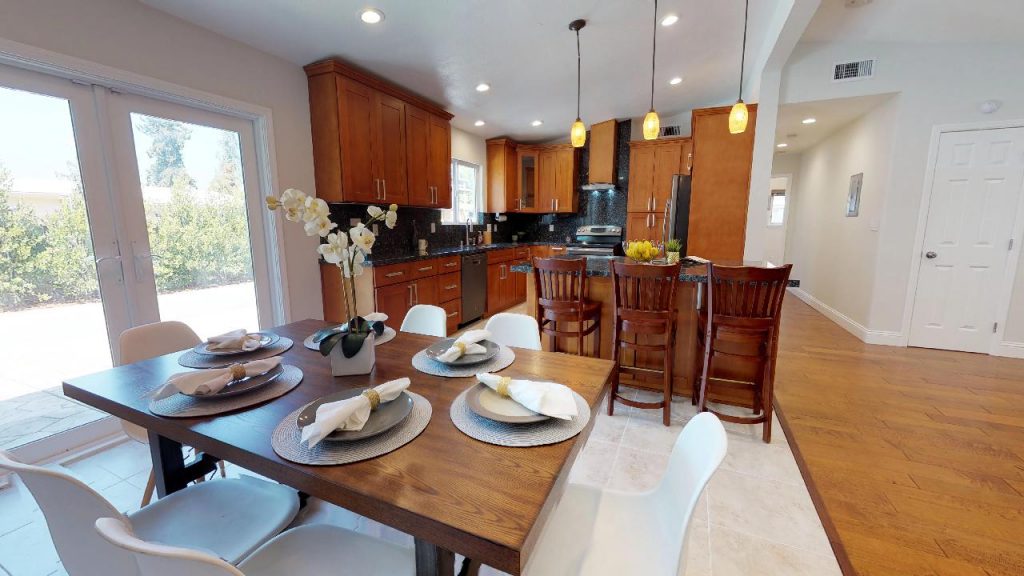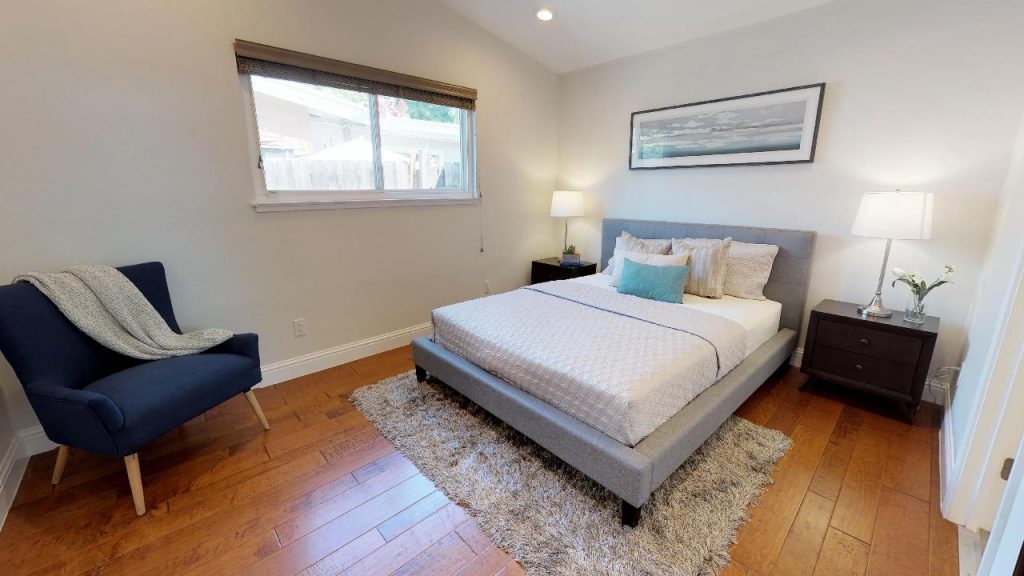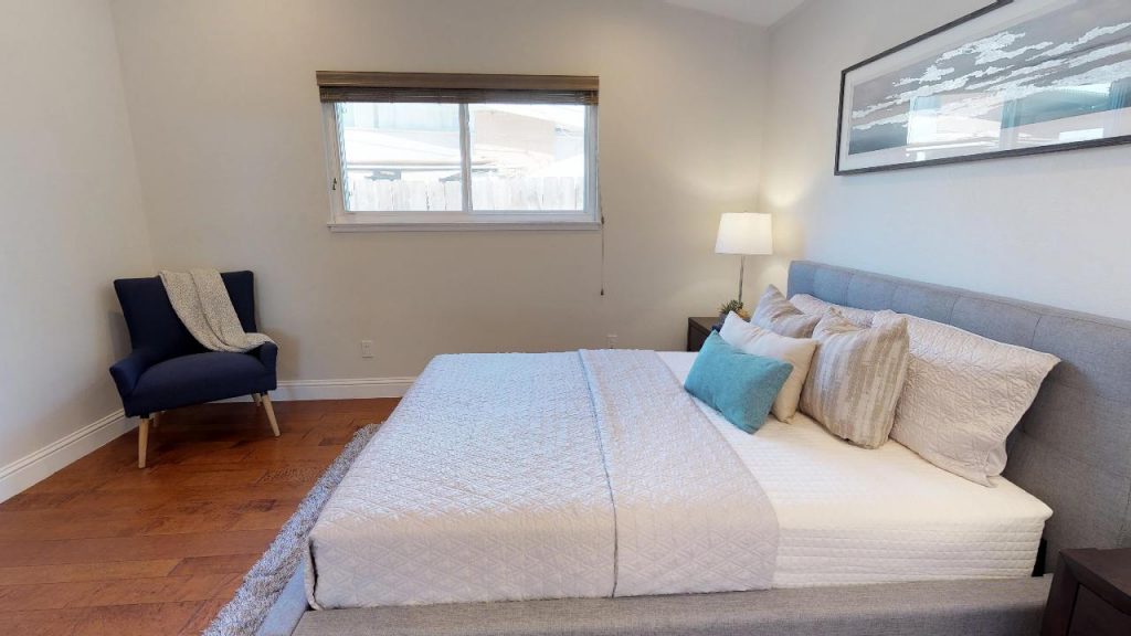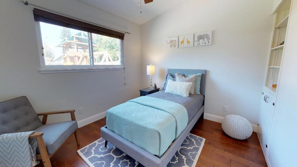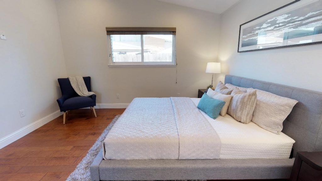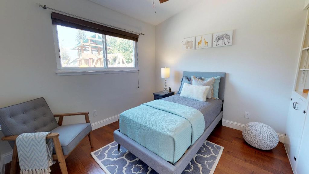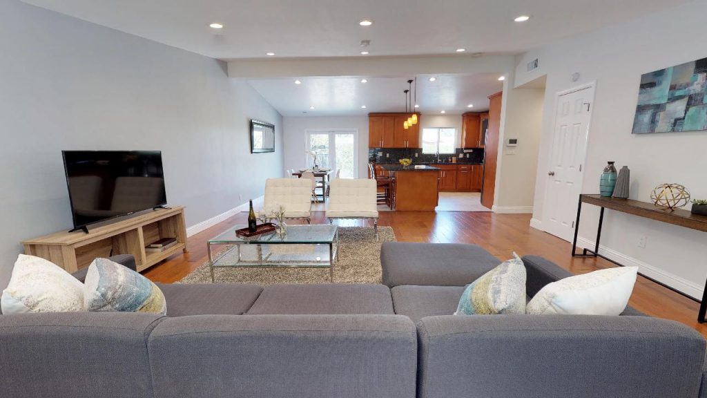 Remodeled in 2015, this beautiful, contemporary home features an expansive great room with dramatic vaulted ceilings open to a large island kitchen. The living room is spacious and features a bay window and recessed LED lighting. A large island kitchen with ample cabinetry, over island drop down pendant and LED recessed lighting, Blue Pearl granite slab countertops, under-mount stainless steel sink, breakfast bar, and stainless steel appliances. Master bedroom suite features a beautiful ensuite bath with dual vanity, walk-in closet with organizers, spacious stall shower with frameless glass enclosure, modern fixtures, hardware, and lighting. Other features include tankless water heater, rustic hand-scraped hardwood flooring throughout, updated insulation, new electrical, new plumbing, children’s play structure, artificial turf, patio with retractable awning, automatic drip irrigation, dual pane windows and french doors, finished 2 car garage with roll-up door and automatic opener.