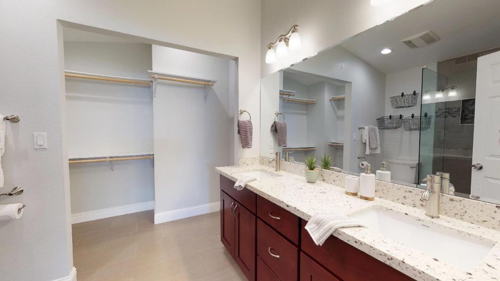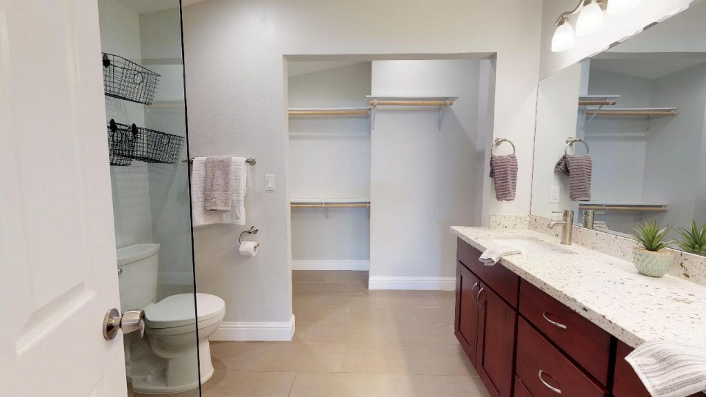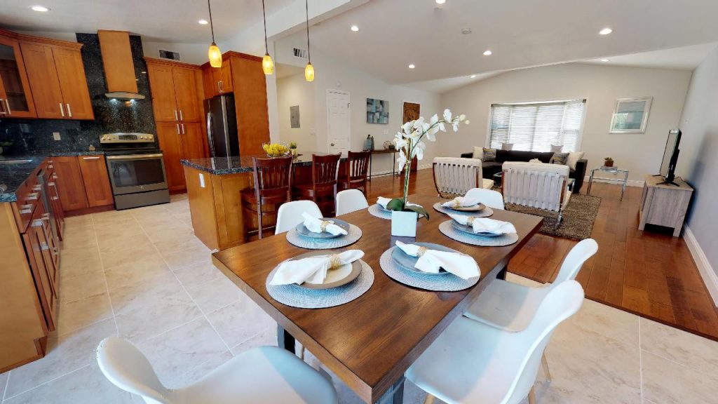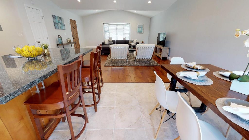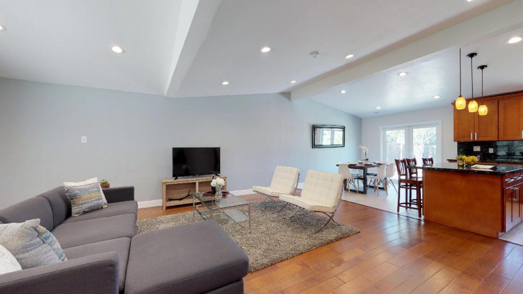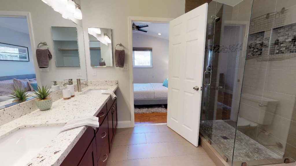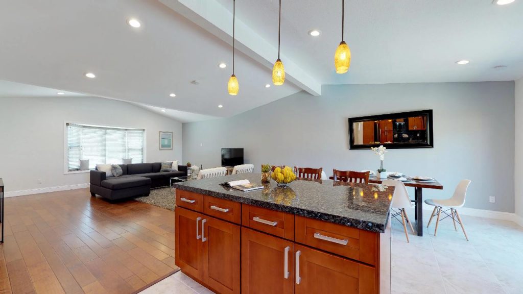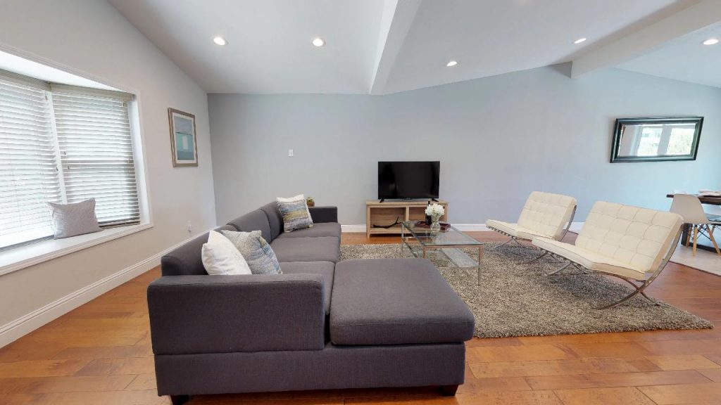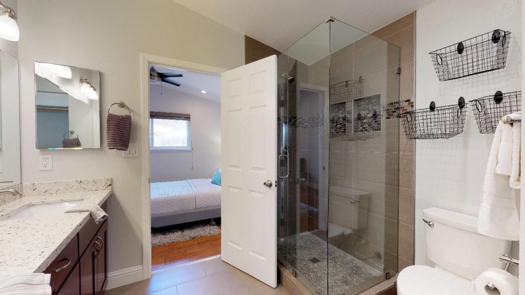 Remodeled in 2015, this beautiful, contemporary home features an expansive great room with dramatic vaulted ceilings open to a large island kitchen. The living room is spacious and features a bay window and recessed LED lighting. A large island kitchen with ample cabinetry, over island drop down pendant and LED recessed lighting, Blue Pearl granite slab countertops, under-mount stainless steel sink, breakfast bar, and stainless steel appliances. Master bedroom suite features a beautiful ensuite bath with dual vanity, walk-in closet with organizers, spacious stall shower with frameless glass enclosure, modern fixtures, hardware, and lighting. Other features include tankless water heater, rustic hand-scraped hardwood flooring throughout, updated insulation, new electrical, new plumbing, children’s play structure, artificial turf, patio with retractable awning, automatic drip irrigation, dual pane windows and french doors, finished 2 car garage with roll-up door and automatic opener.