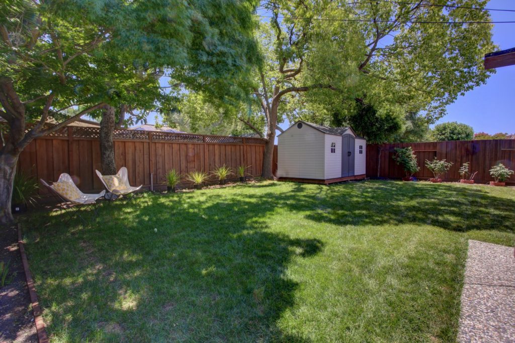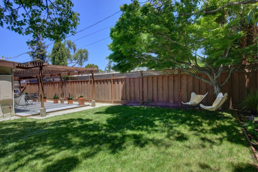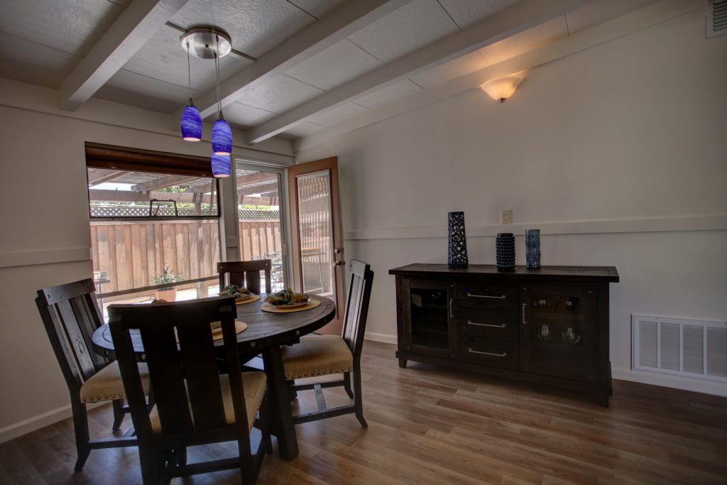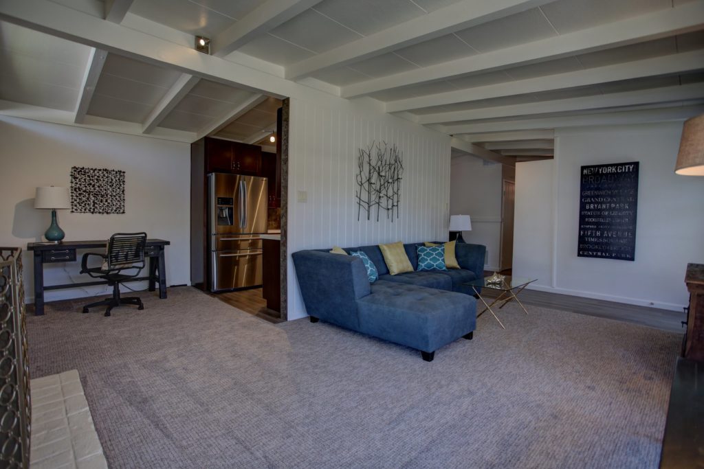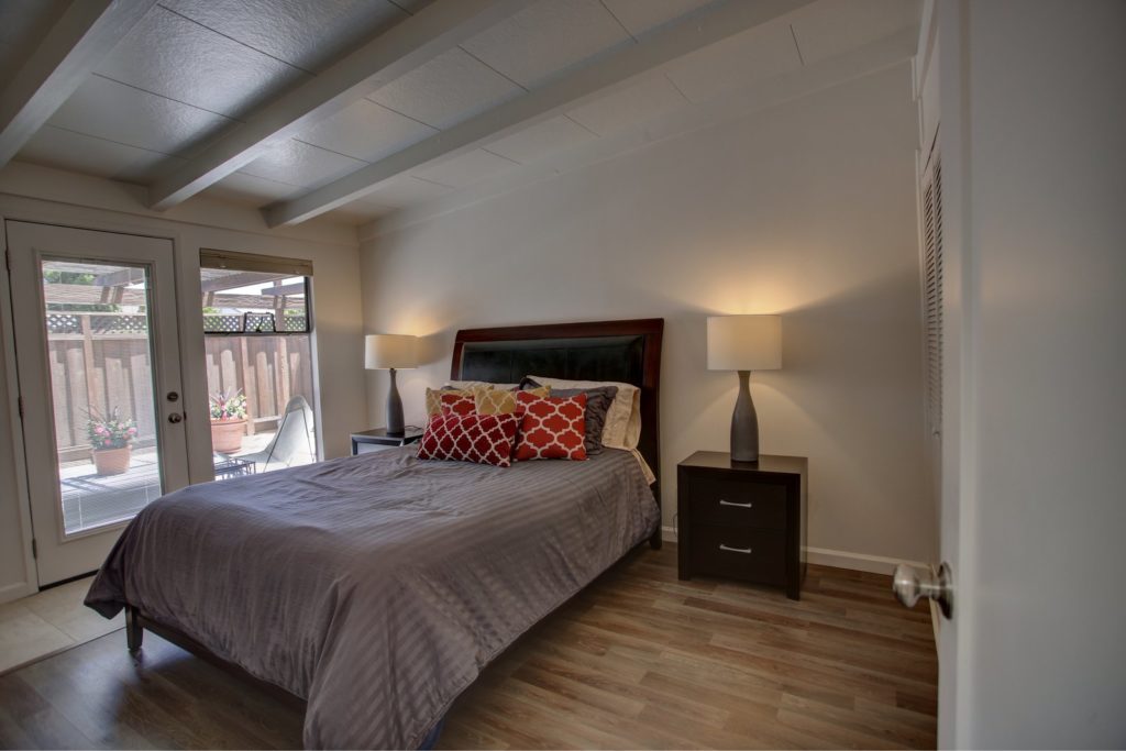 Updated Mid-Century Modern style home in a quiet neighborhood walking distance to Santa Clara’s Central Park. Updated kitchen stainless steel appliances, wood cabinetry, quartz countertops & subway tile backsplash. Modern lighting throughout w/ wall sconces & overhead fixtures. Interior walls are all insulated reducing room to room noise. Living room features plush high-end Berber carpet & stylish brick fireplace w/ infrared heating element. Exterior doors feature blinds in pane & garage door with auto opener. All closet sliders in the house including closet doors are covered in decorative “Wilsonart” laminate. Hall bathroom features Terrazzo tile in shower enclosure and floor and natural light thru skylight. Master features door to back deck & private bath with tiled shower stall. Private backyard has a perfect outdoor grilling area with plumbed in gas on a new composite deck & large shaded lawn area. Other features include finished garage, double sized storage shed, & foam roof.