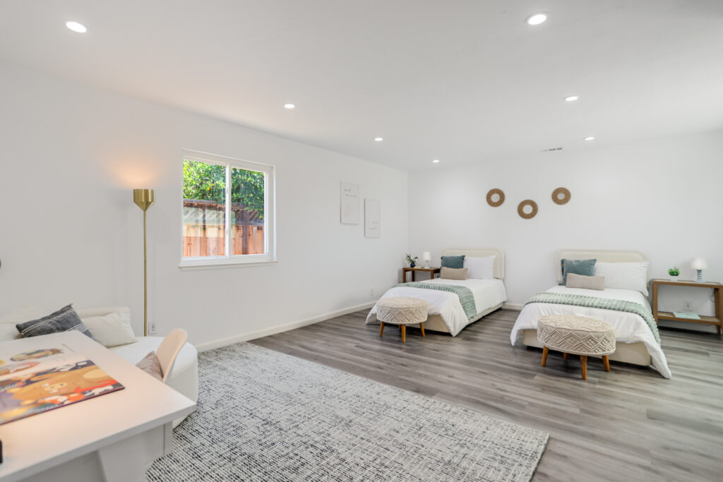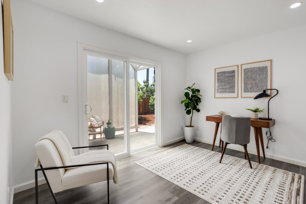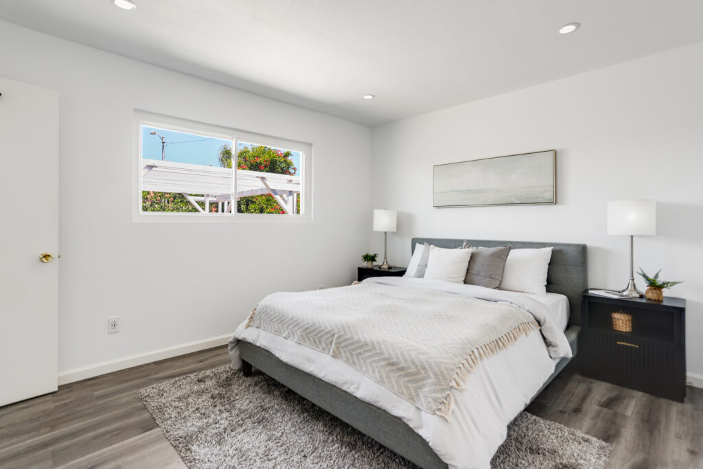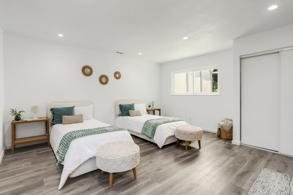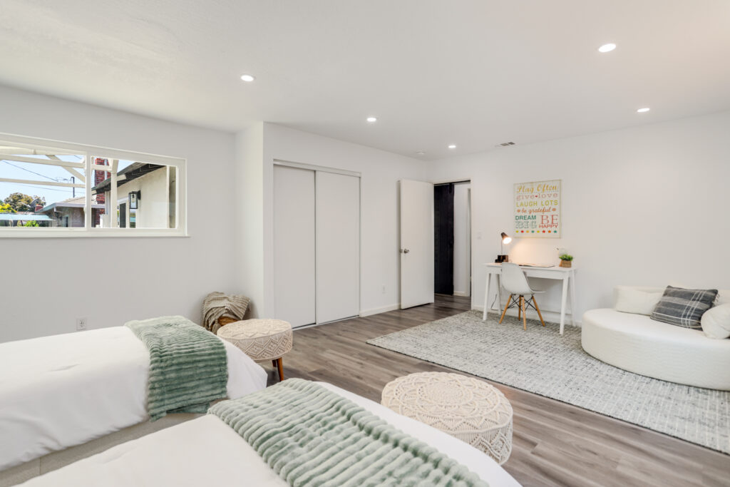 Each of the two guest bedrooms offers ample room—one oversized and thoughtfully expanded—while the private primary suite boasts its own ensuite bath, stylishly remodeled with designer fixtures and finishes. Throughout the home, LED recessed lighting, dual-pane windows (and sliding doors), plus central heating and AC ensure year-round comfort.