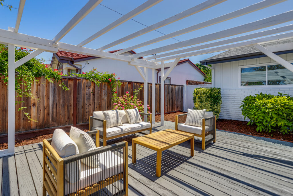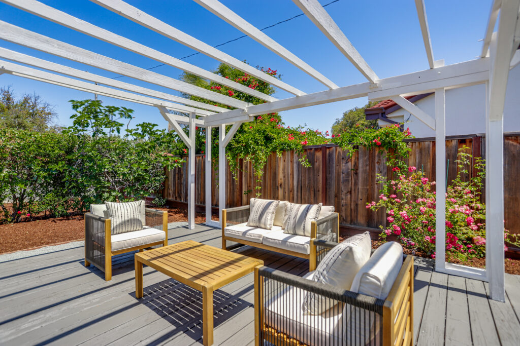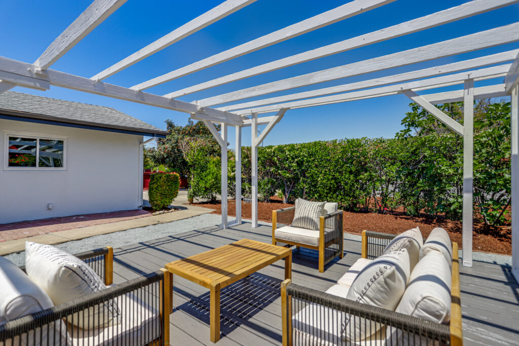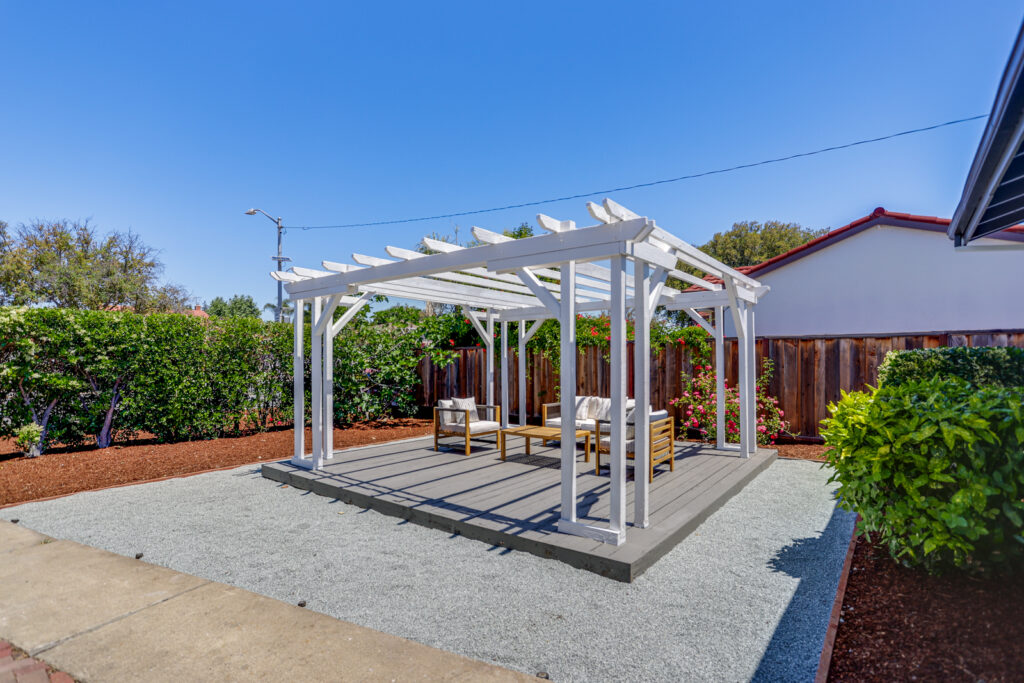- Landscaped front yard, offering privacy with a large gazebo-style deck