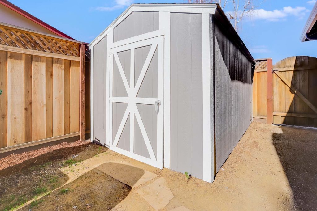 - Storage shed with built-in shelving