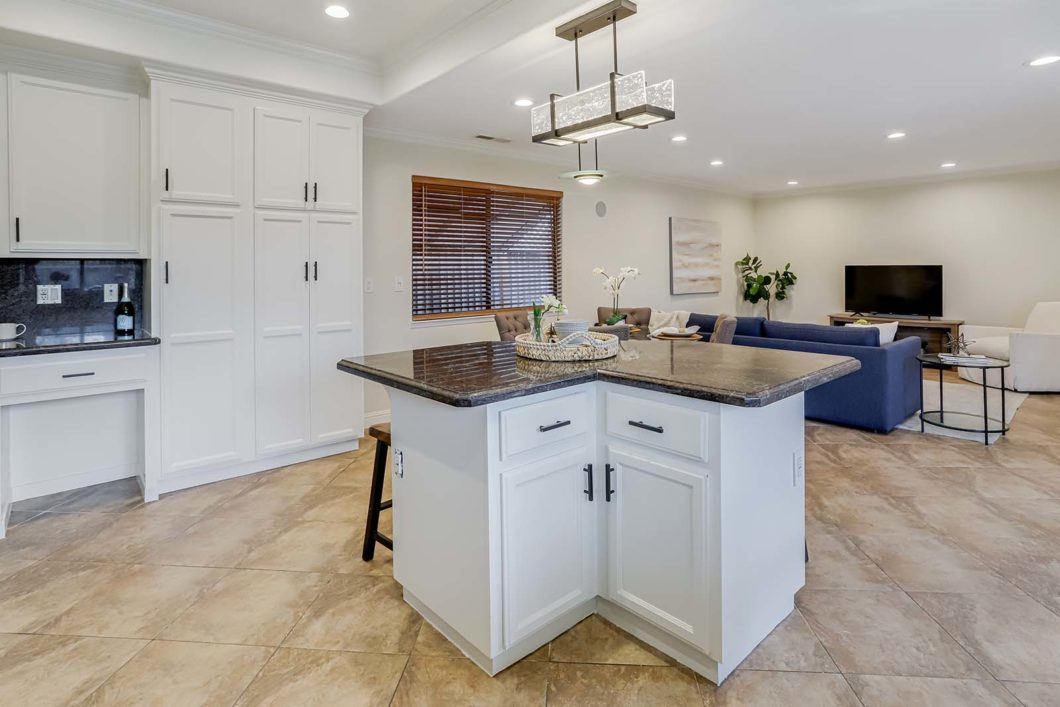 - Entertainer’s kitchen with updated cabinets, granite countertops, stainless steel appliances, and island overlooking the great room