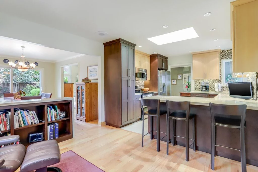Updated eat-in kitchen boasts an oversized skylight, flooding the space with natural light.