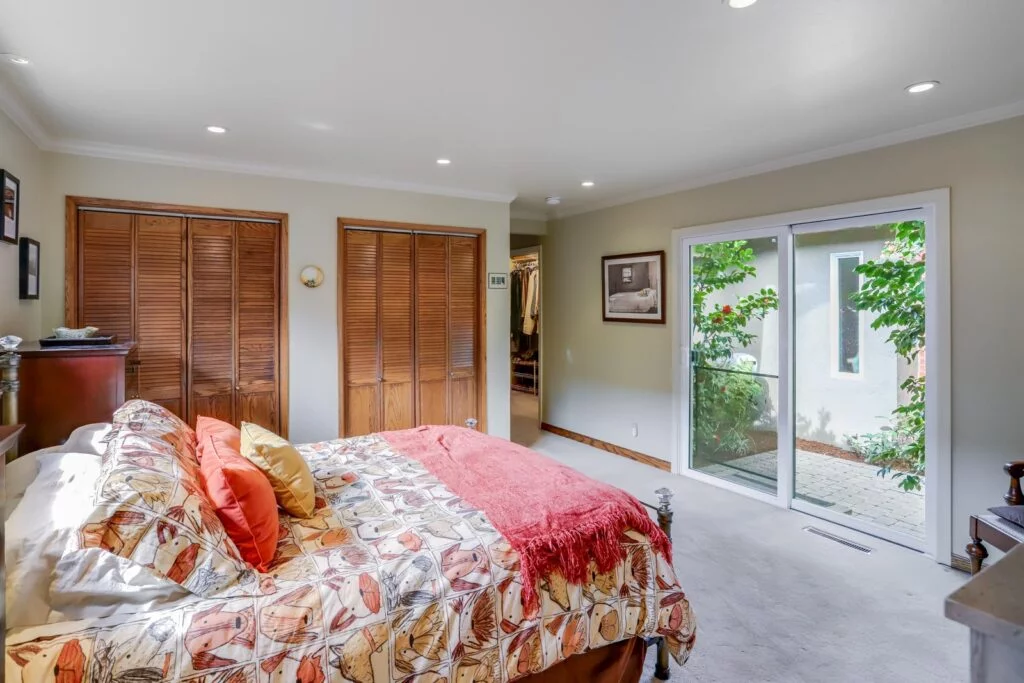 The spacious primary retreat features a private entrance to the backyard, ideal for creating a personal sanctuary.