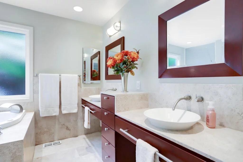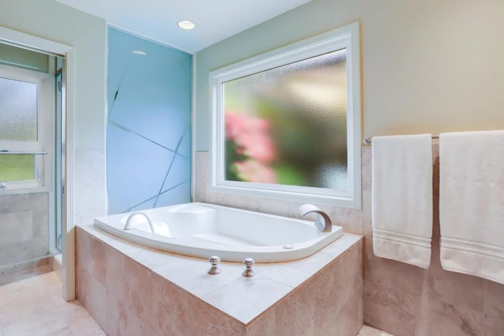 Unwind in the luxurious bathroom, featuring a heat and glow fireplace, a steam shower, heated medicine cabinets, and a relaxing jacuzzi tub.