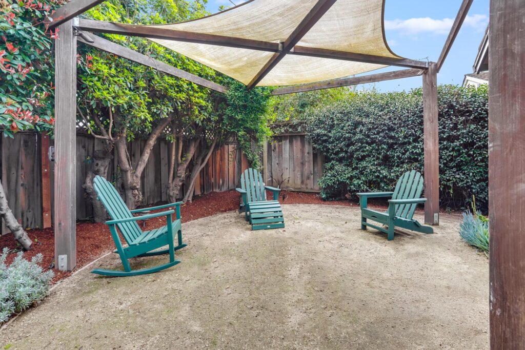 An additional seating area with a pergola and a calming water feature creates a tranquil escape.