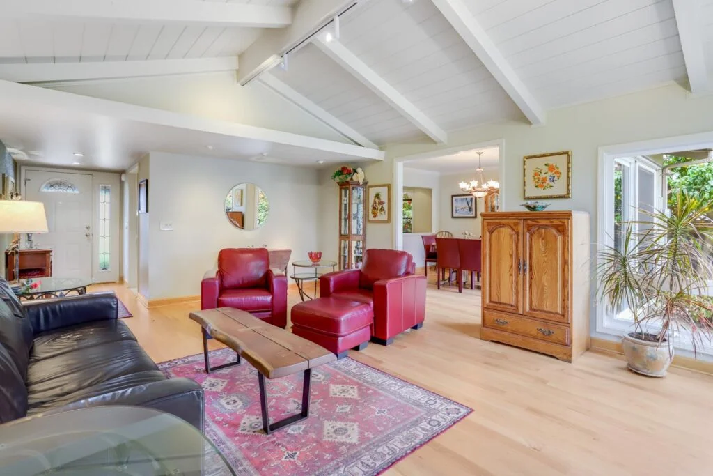 Soaring vaulted ceilings with exposed beams create a sense of spaciousness and character.