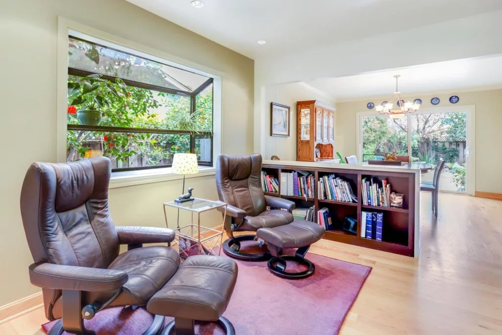 The dining room grants easy access to the backyard, perfect for indoor-outdoor entertaining.