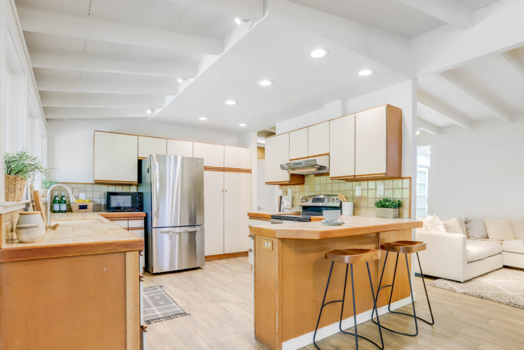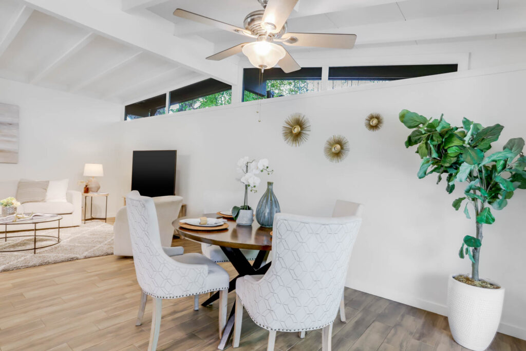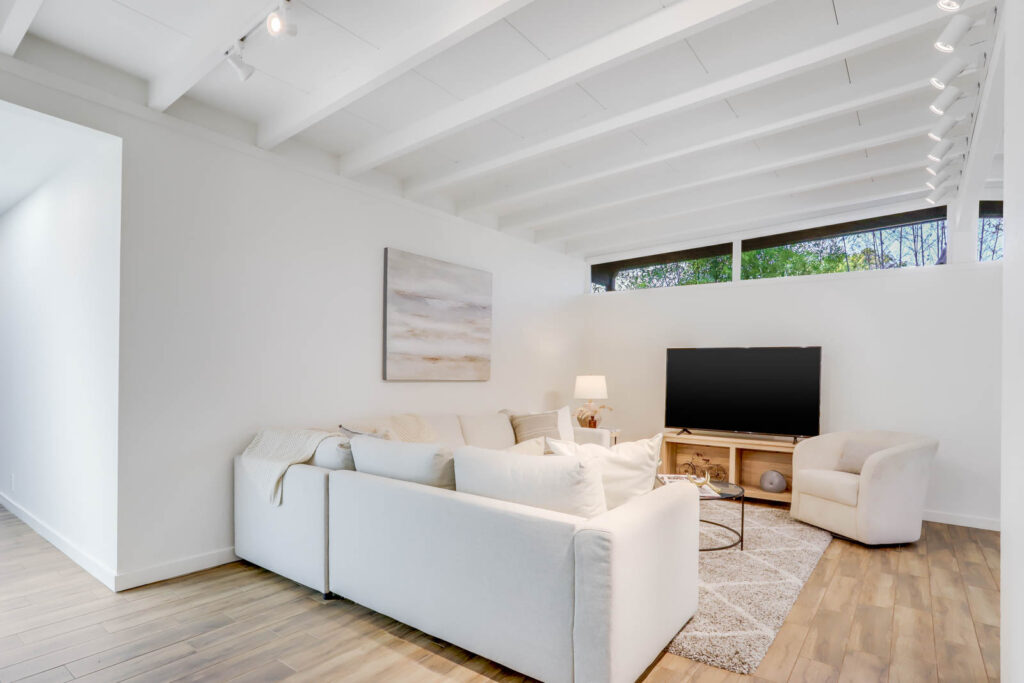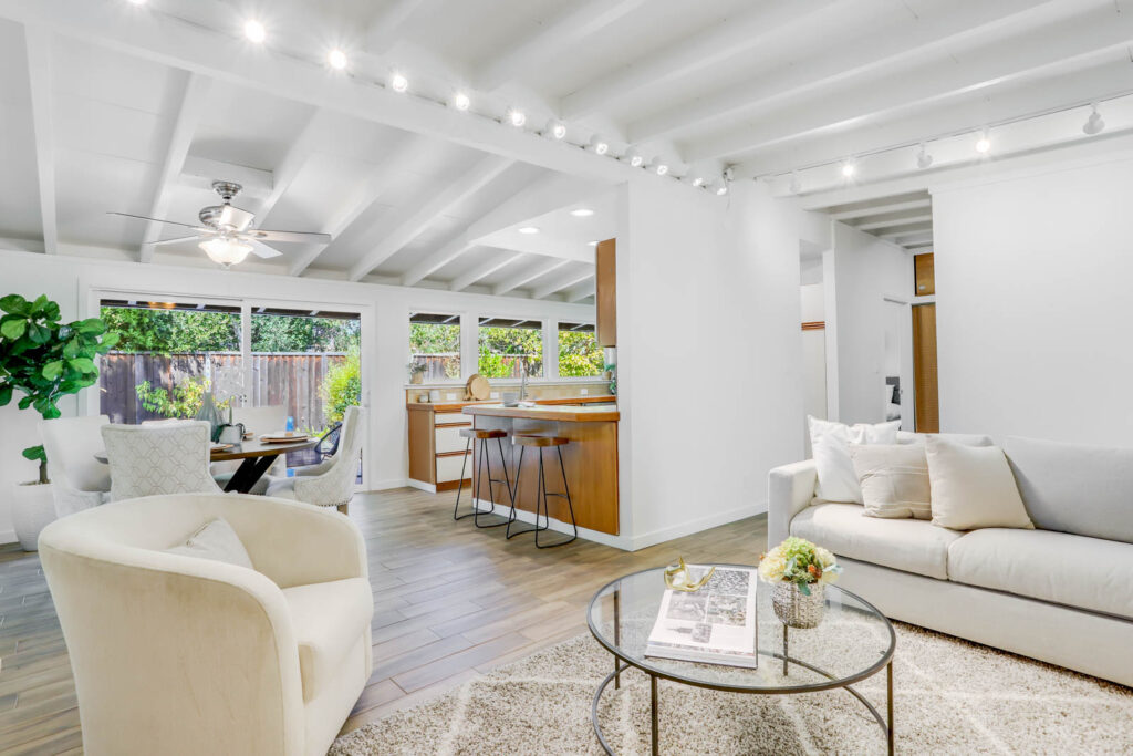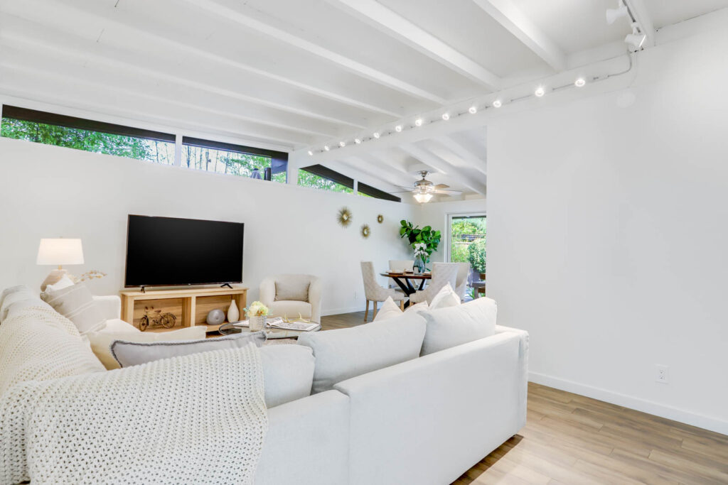 - Mid-century modern style with exposed beam ceiling, clerestory windows letting in plenty of natural light