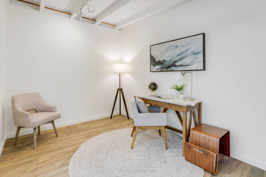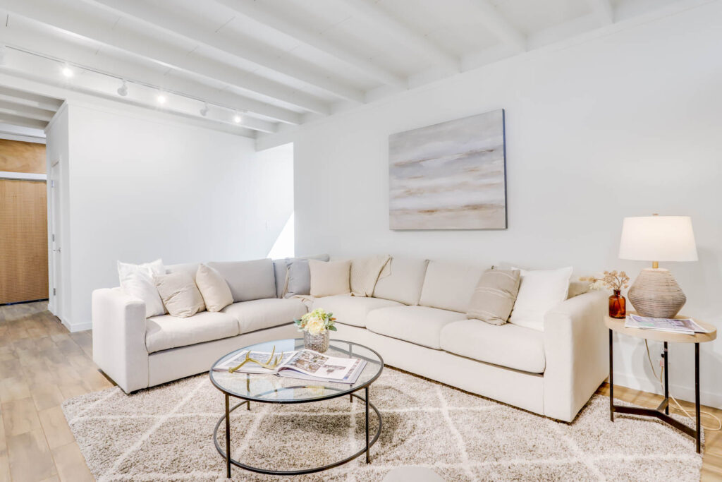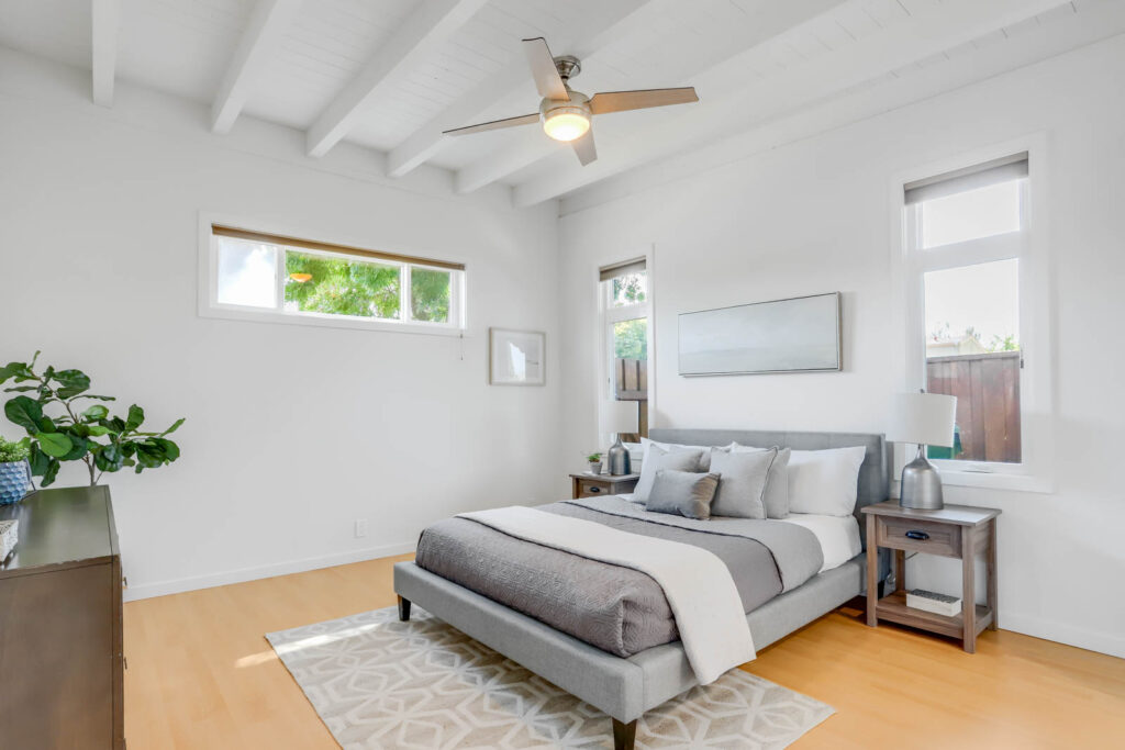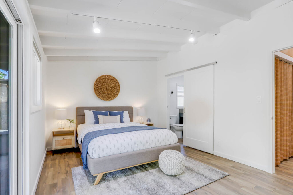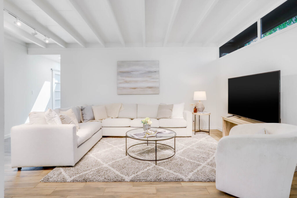 - Mid-century modern style with exposed beam ceiling, clerestory windows letting in plenty of natural light