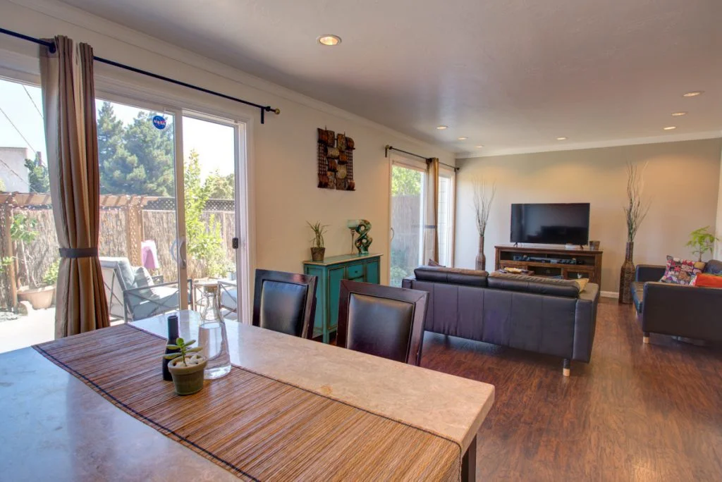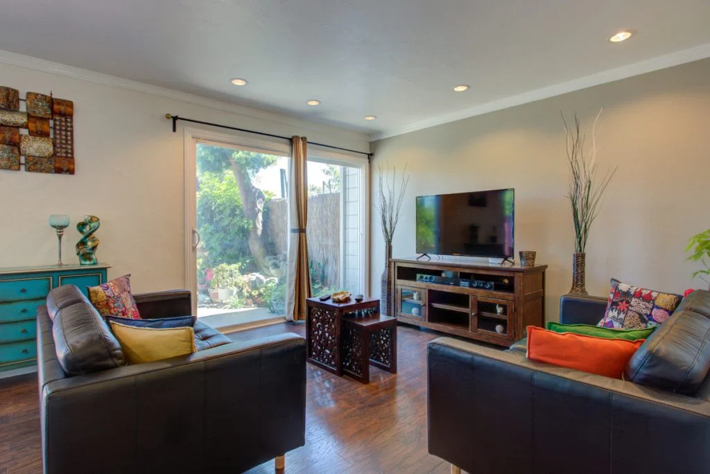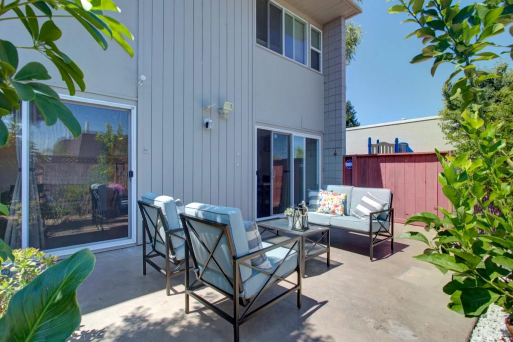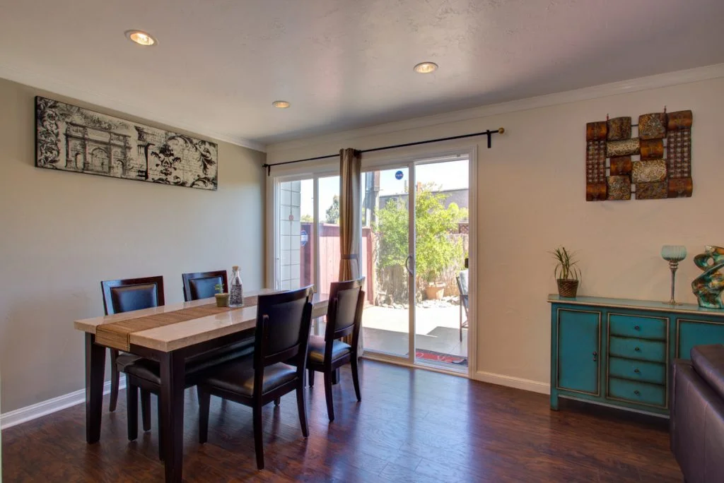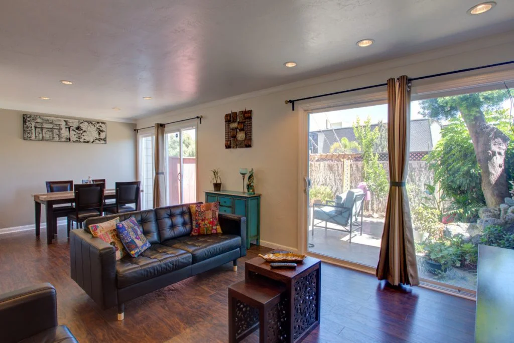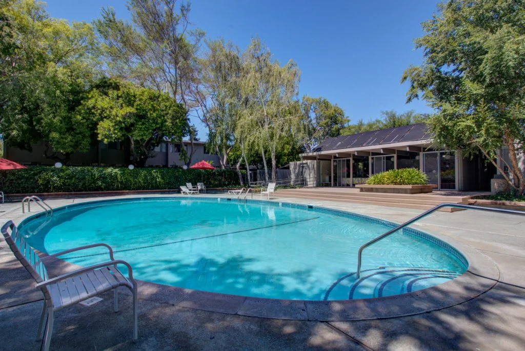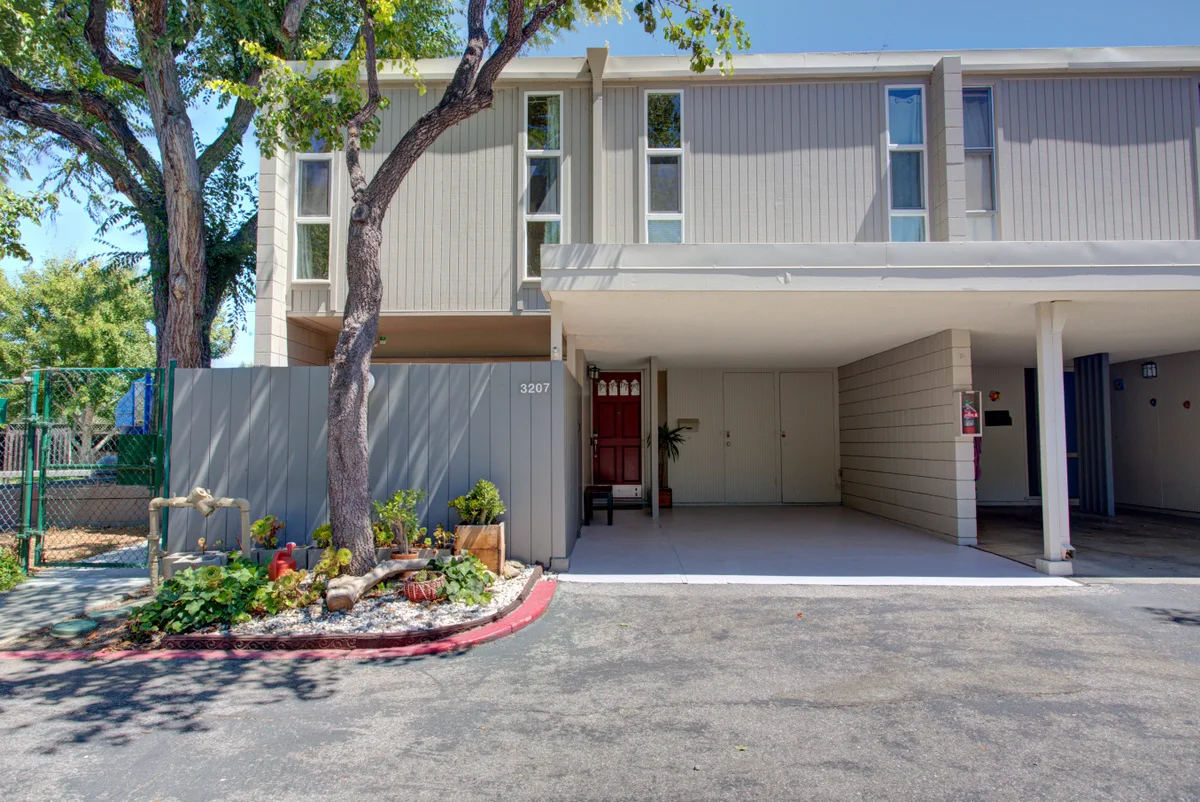 Beautifully-maintained Eichler townhome located in the heart of Santa Clara features a bright and spacious living/dining area with LED recessed lighting and two sliding glass doors, four sizeable bedrooms, and two outdoor areas. End unit home is part of a well-managed Co-Op and features excellent common facilities including a private playground and large pool with clubhouse. Updated eat-in kitchen features granite countertops, solid-hardwood cabinetry, farmhouse sink, gorgeous tile flooring/backsplash, and dining area with built-ins for extra storage. Second-level is complete with high Eichler ceilings and large master with ensuite. Other features include two secluded outdoor areas that are perfect for entertaining, attached private carport, dual-pane windows/sliders, and radiant heating. Sits a short distance away from Apple Spaceship campus, parks, & shopping.