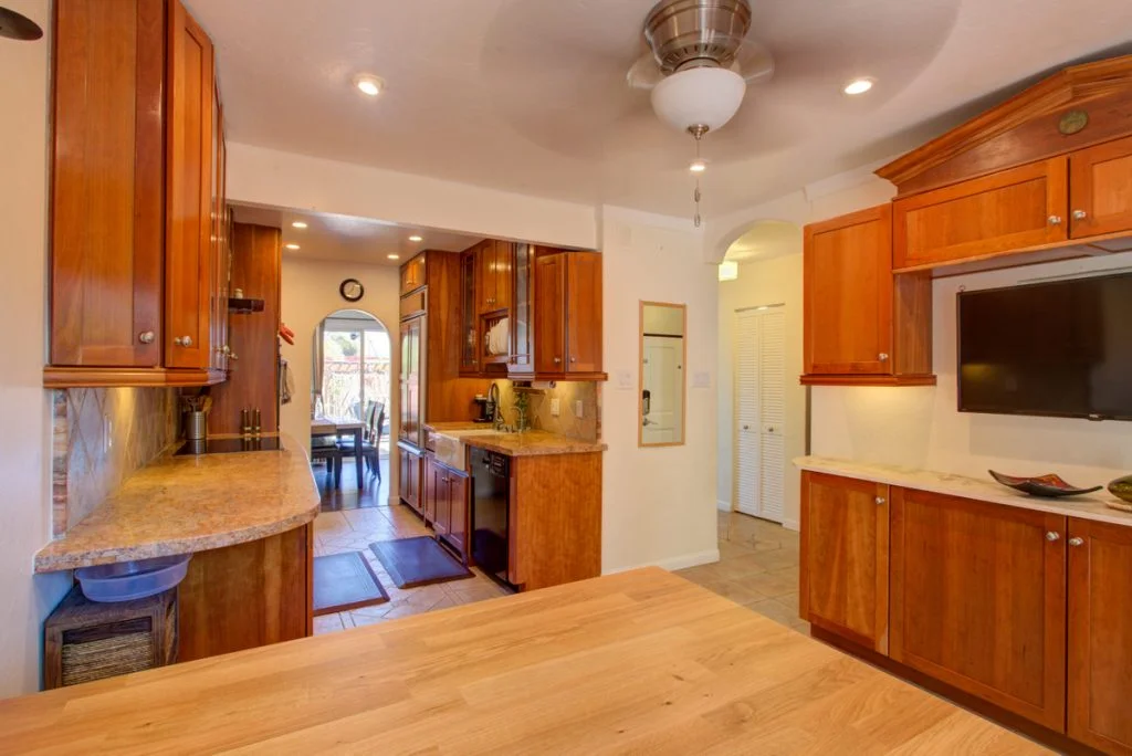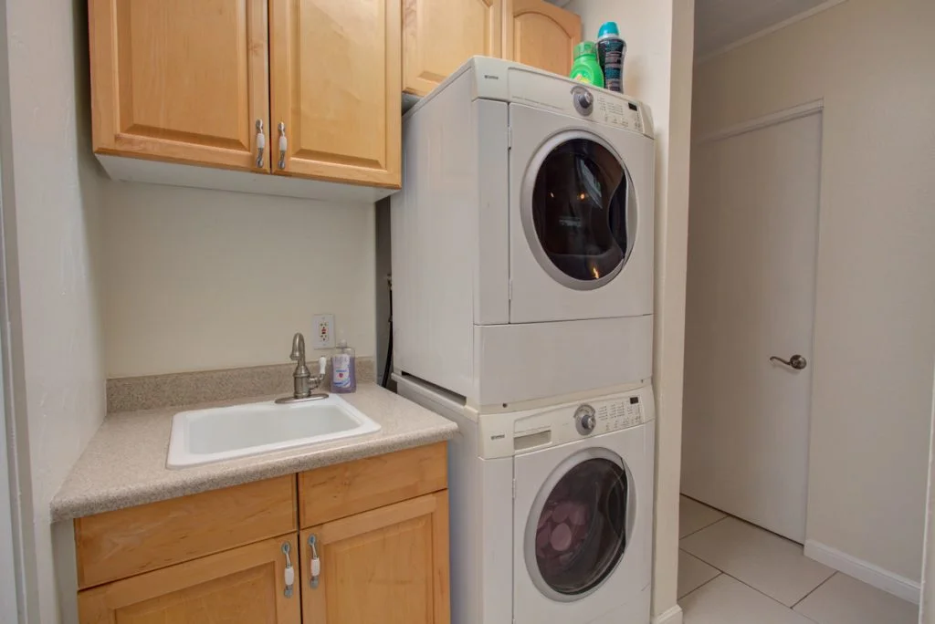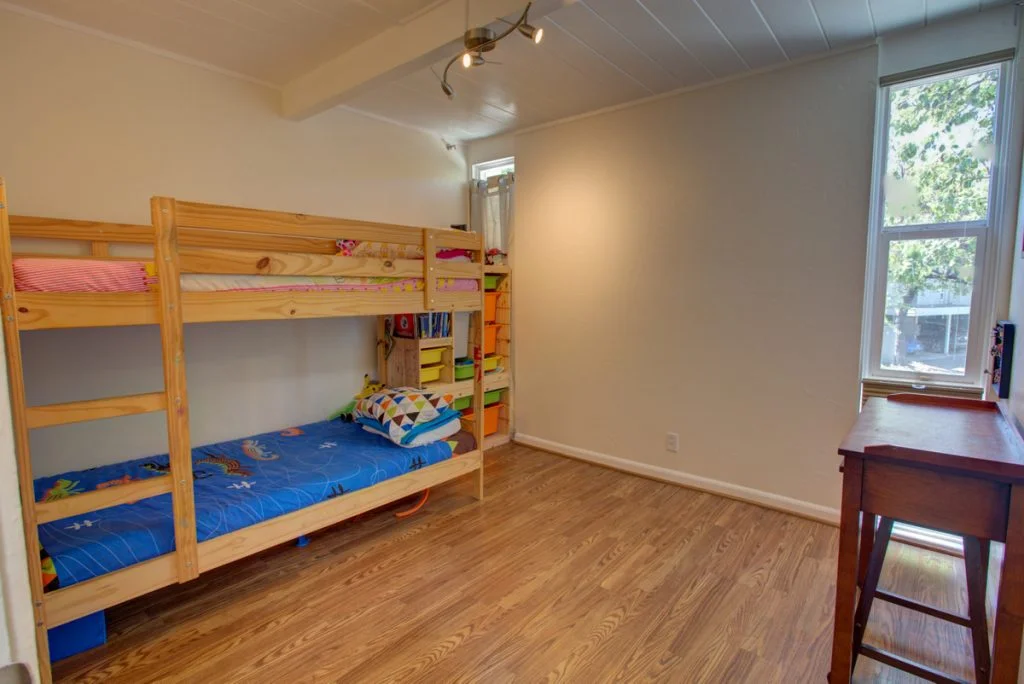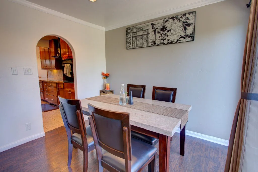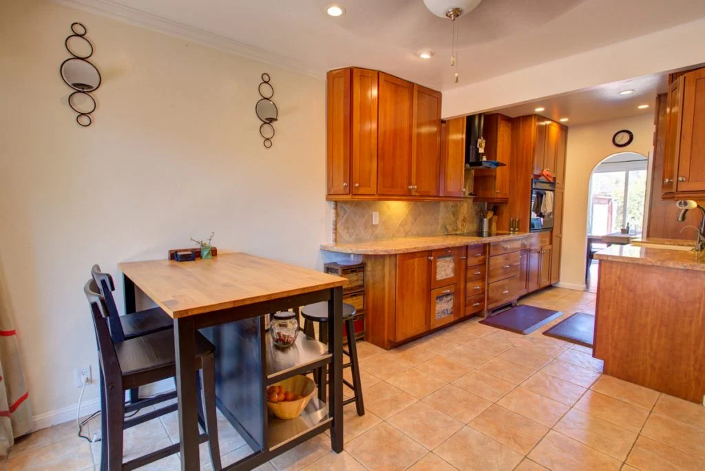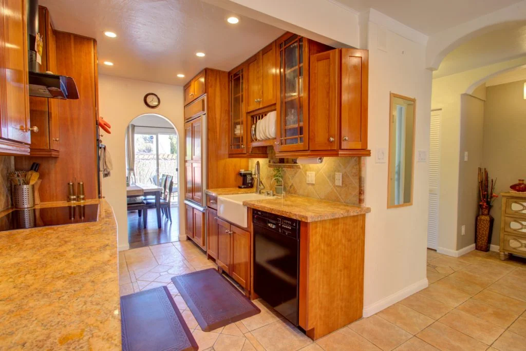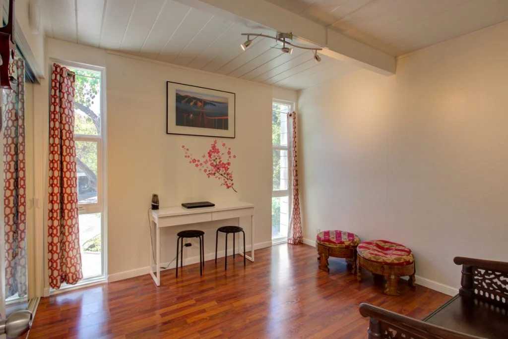 Beautifully-maintained Eichler townhome located in the heart of Santa Clara features a bright and spacious living/dining area with LED recessed lighting and two sliding glass doors, four sizeable bedrooms, and two outdoor areas. End unit home is part of a well-managed Co-Op and features excellent common facilities including a private playground and large pool with clubhouse. Updated eat-in kitchen features granite countertops, solid-hardwood cabinetry, farmhouse sink, gorgeous tile flooring/backsplash, and dining area with built-ins for extra storage. Second-level is complete with high Eichler ceilings and large master with ensuite. Other features include two secluded outdoor areas that are perfect for entertaining, attached private carport, dual-pane windows/sliders, and radiant heating. Sits a short distance away from Apple Spaceship campus, parks, & shopping.