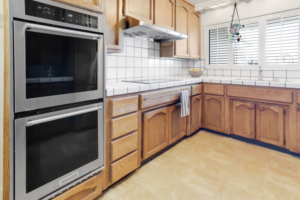 - Newer modern cooktop, extractor hood, and double oven in kitchen