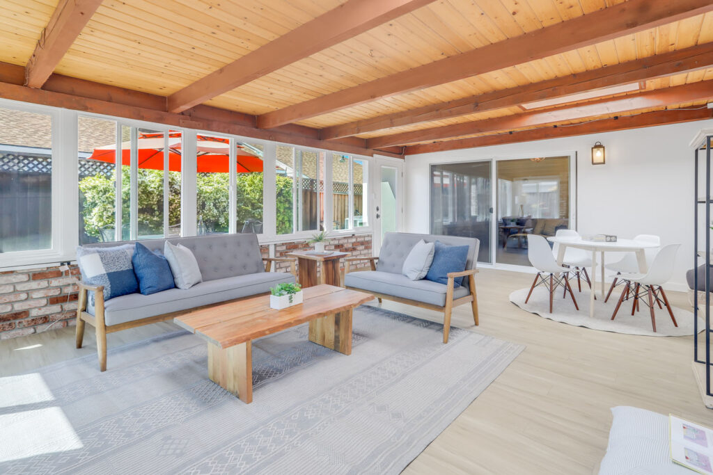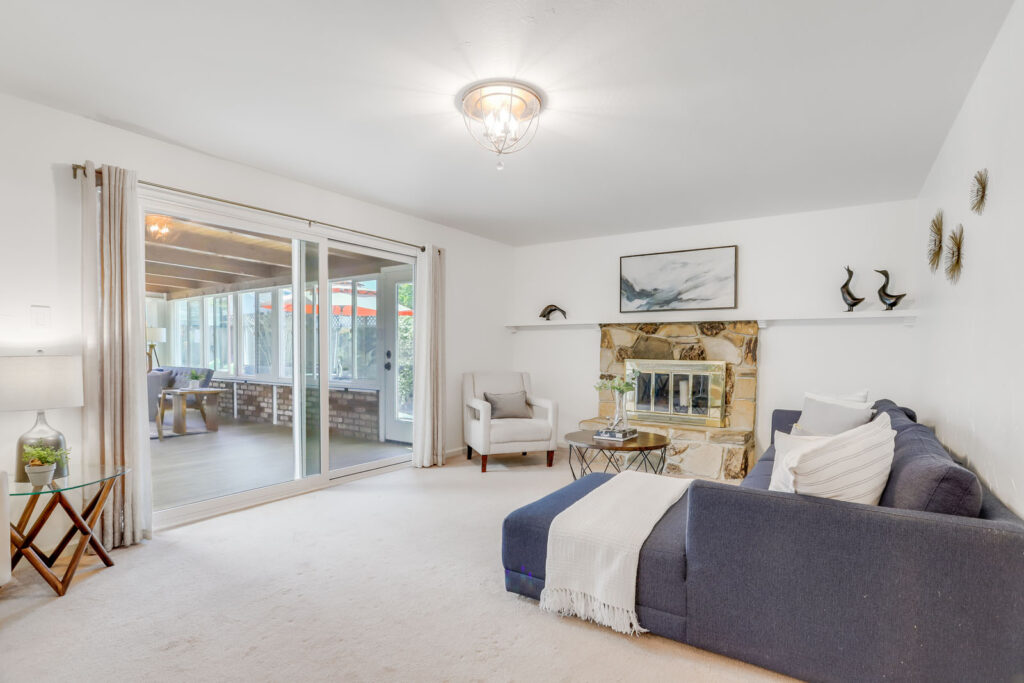 - Large permitted screen/bonus room features an exposed beam ceiling, durable flooring, and cozy fireplace