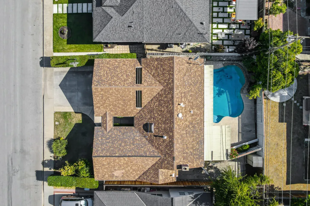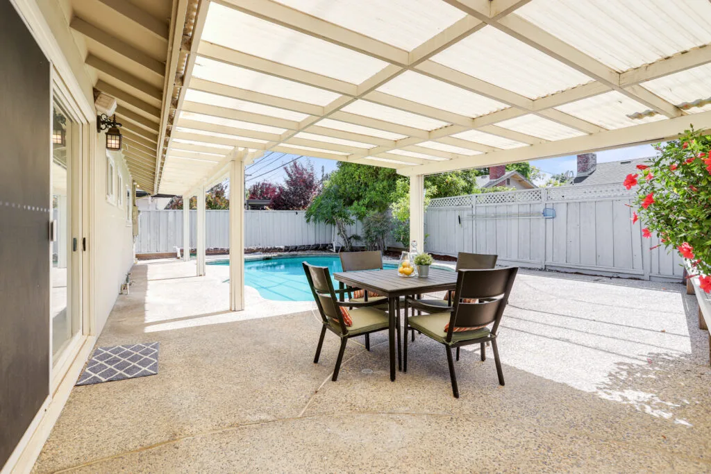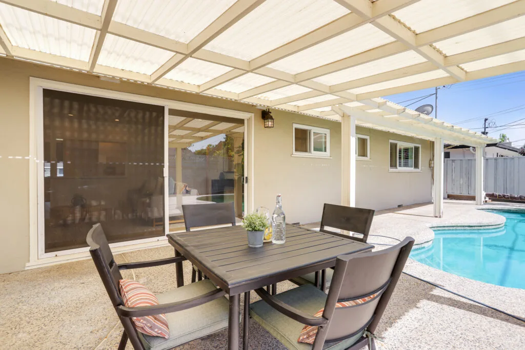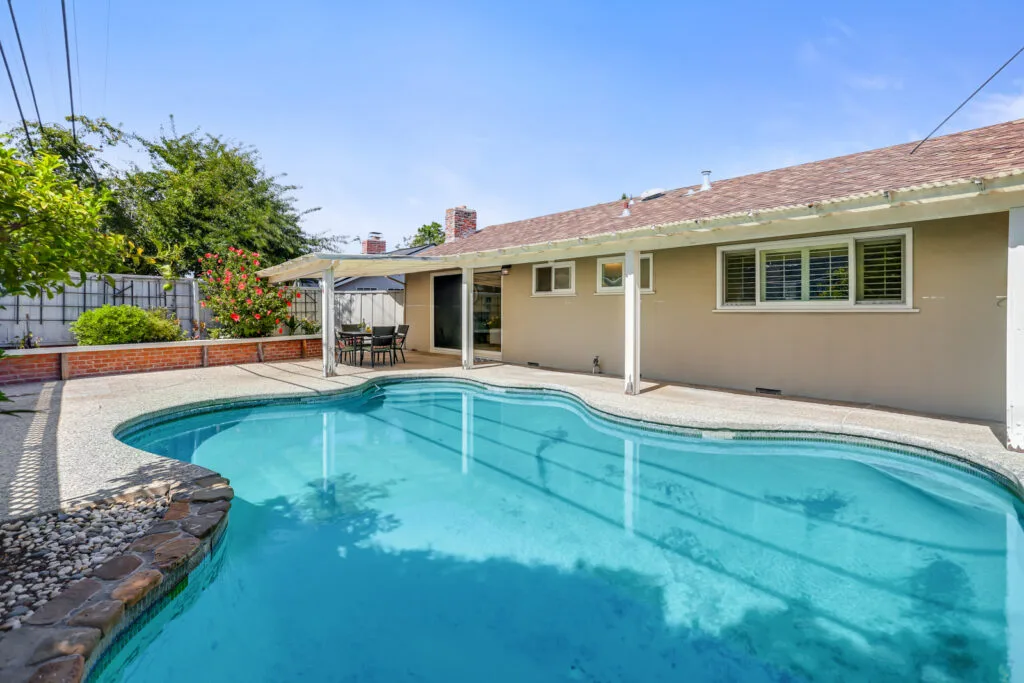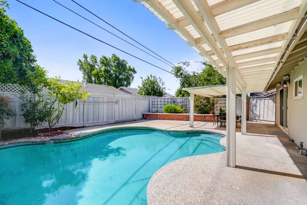 - Backyard with pool and covered patio area