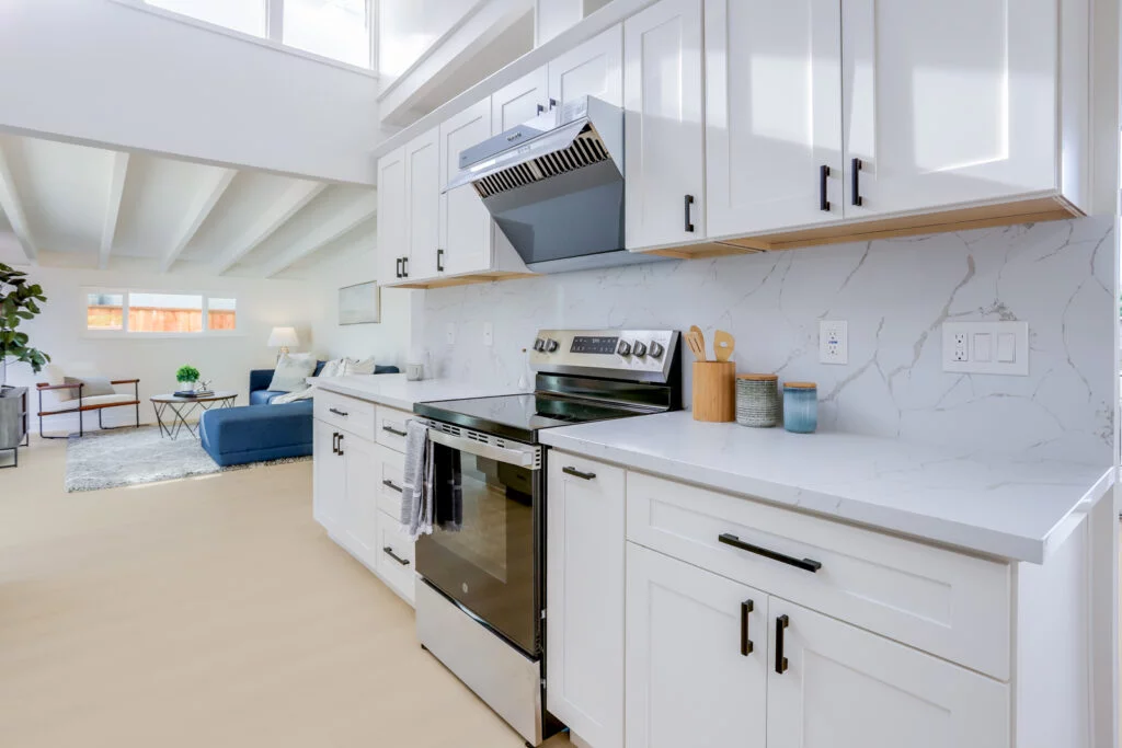 - Open design kitchen features shaker cabinets, stainless steel appliances, quartz countertops, and backsplash