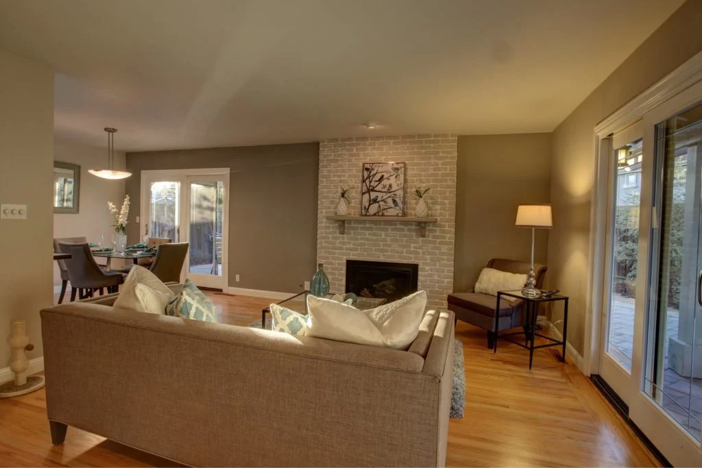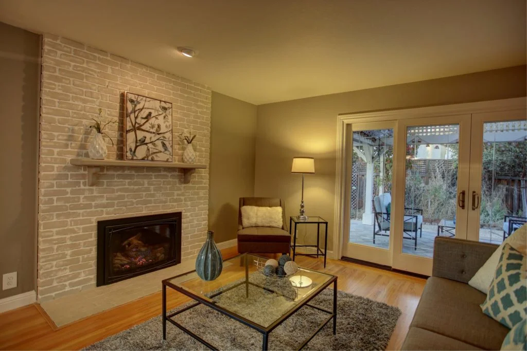 The living room has recessed lighting & Mendota remote controlled gas fireplace insert.