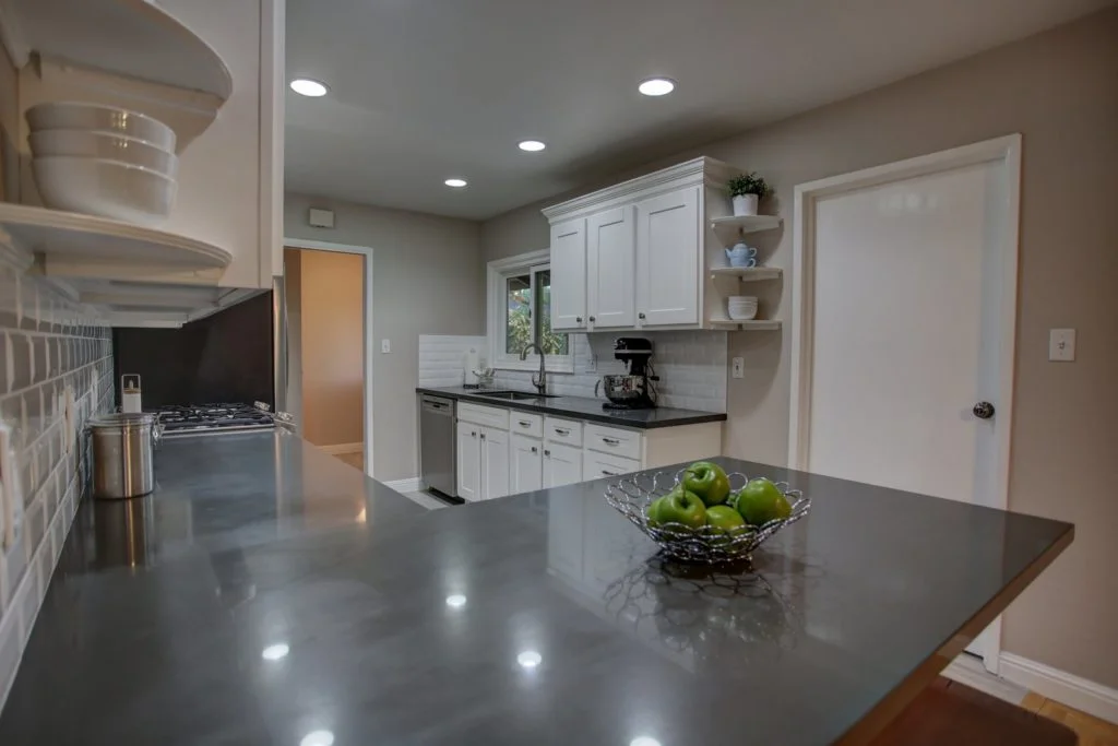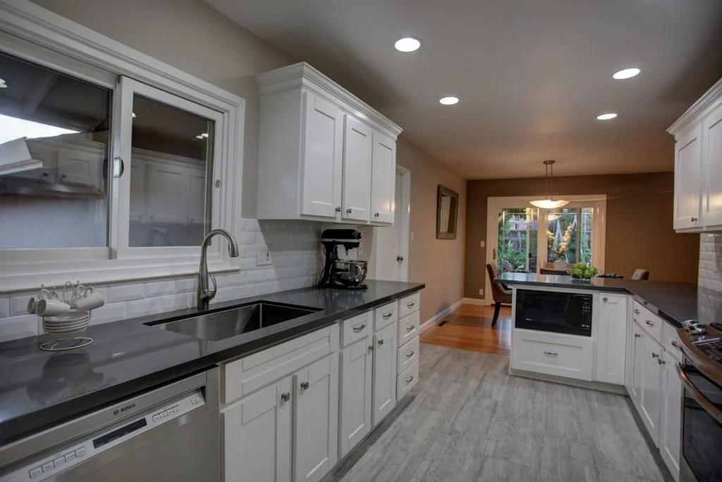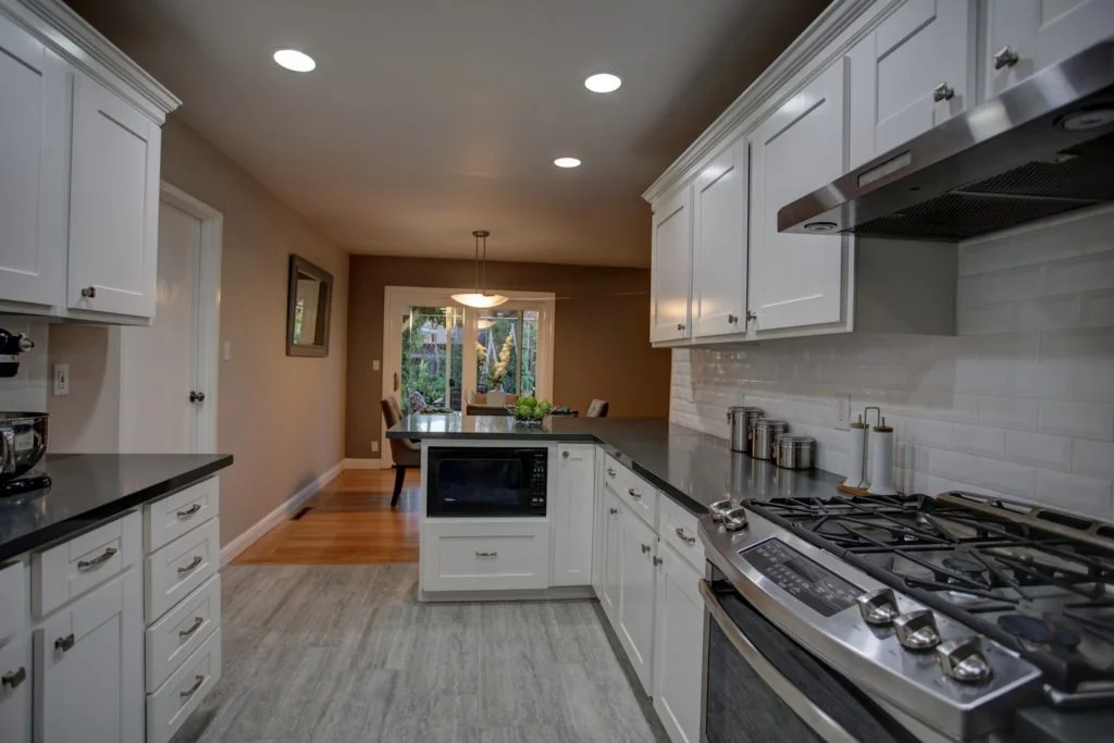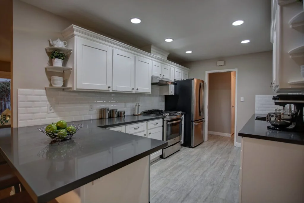 Kitchen has shaker style cabinets, quartz countertops, porcelain tile floors, recessed LED lighting, gas range & high-quality stainless steel appliances.