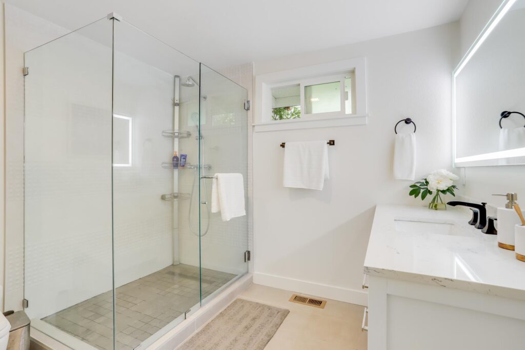 - Two beautifully remodeled bathrooms with frameless glass enclosures and quartz countertops