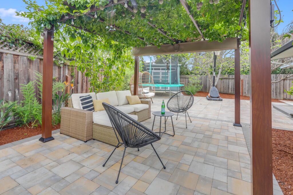 - Professionally landscaped backyard with expansive paver patio, flower beds, pergola, and side yard