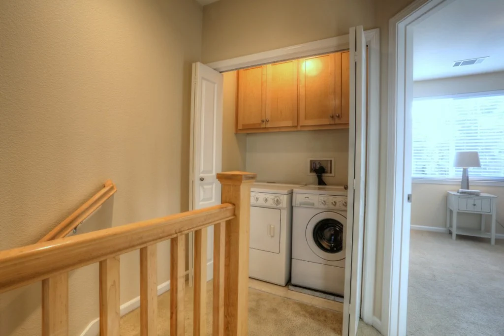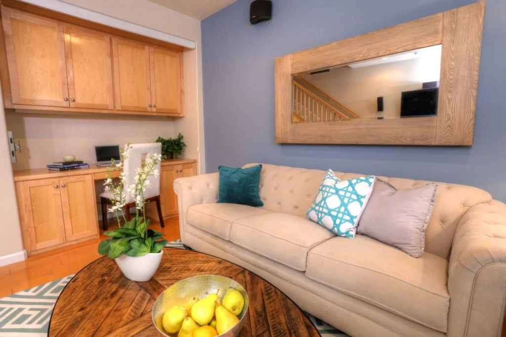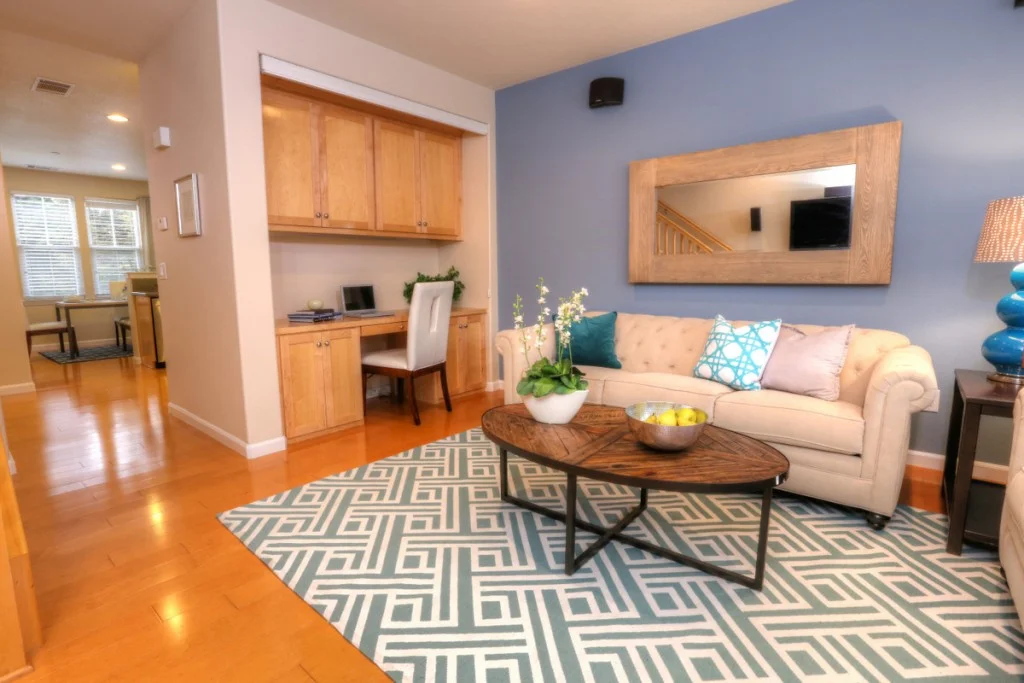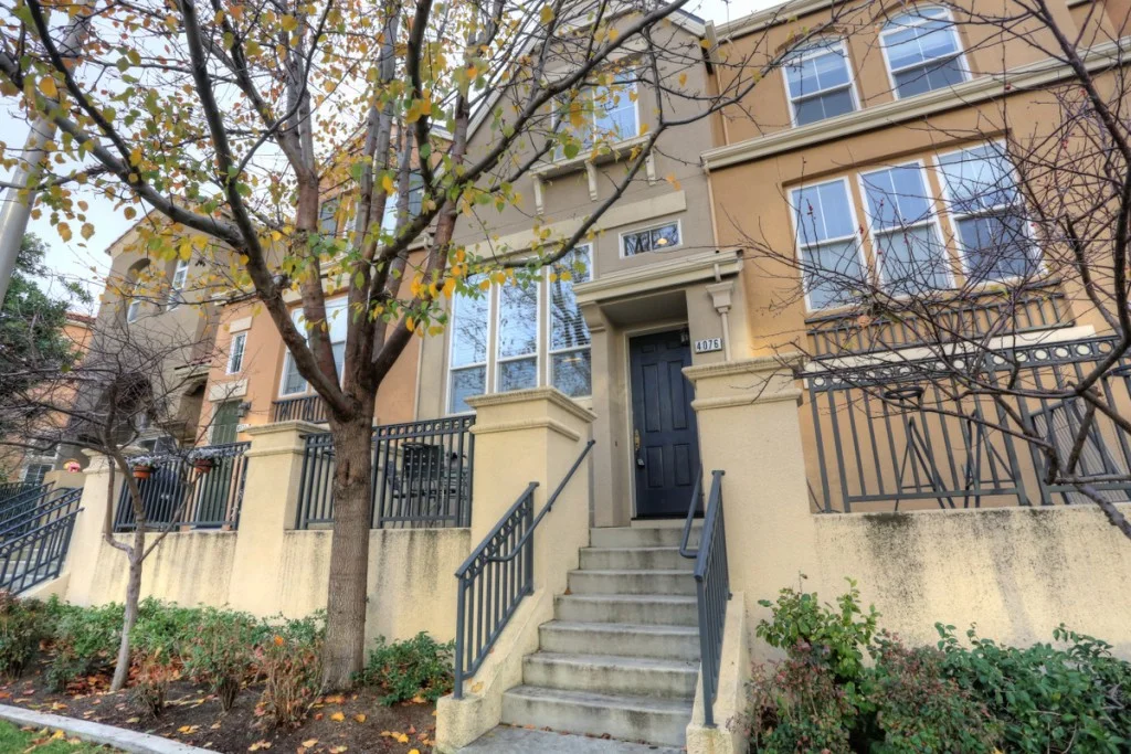 Stylish Rivermark Townhome – Park Plan 2 model. Home features hardwood flooring, stainless steel appliances, granite countertops, and includeds wall mounted flatscreen tv and AV equipment.