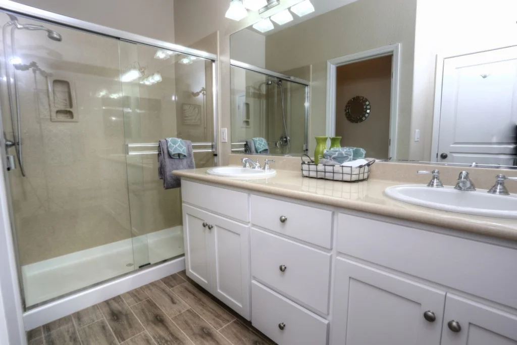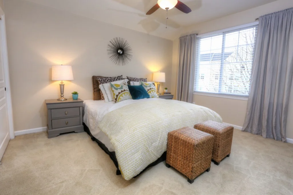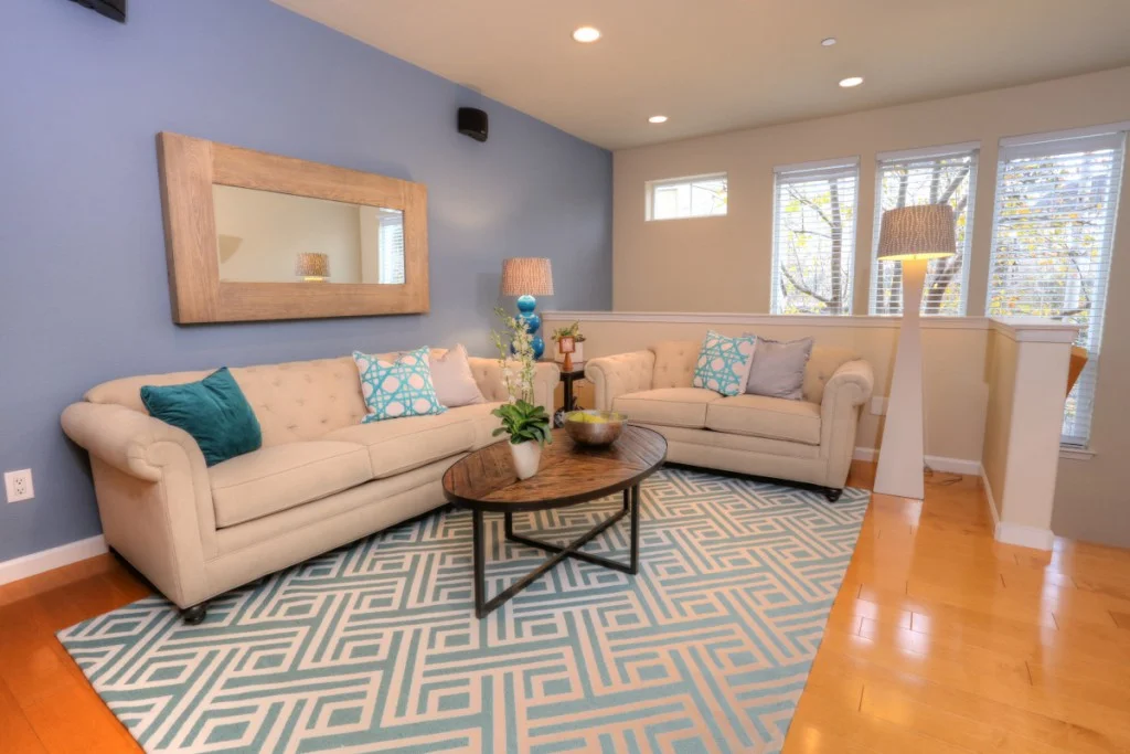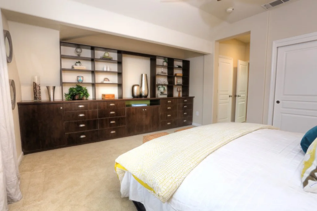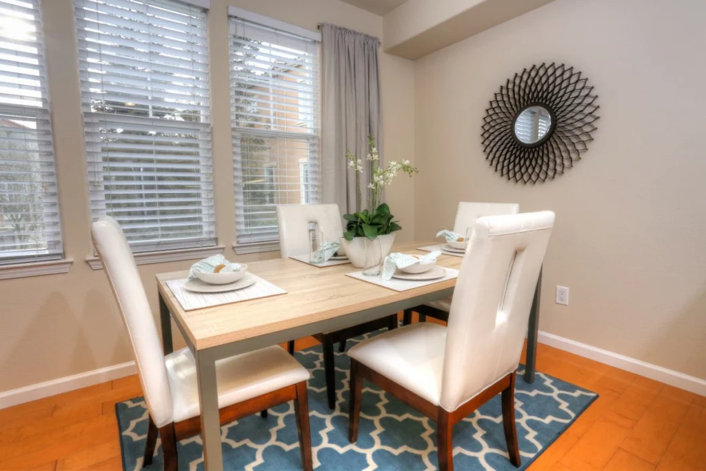 Stylish Rivermark Townhome – Park Plan 2 model. Home features hardwood flooring, stainless steel appliances, granite countertops, and includeds wall mounted flatscreen tv and AV equipment.