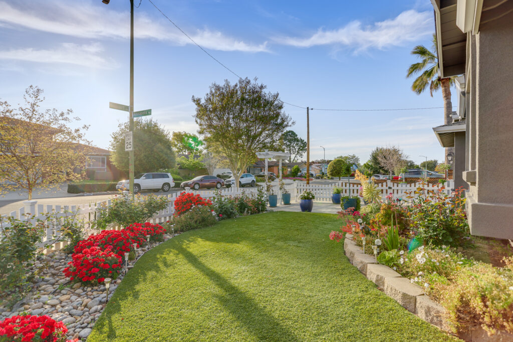 - Beautiful front garden with artificial grass, roses, flowers, and succulents