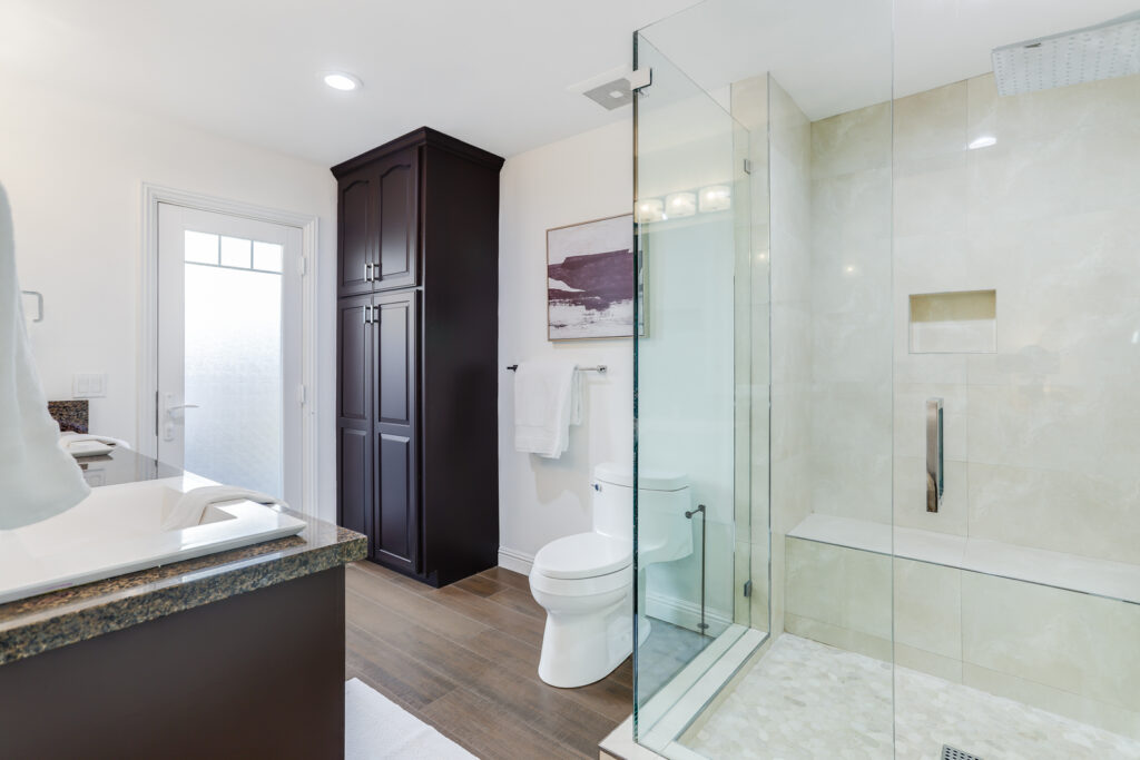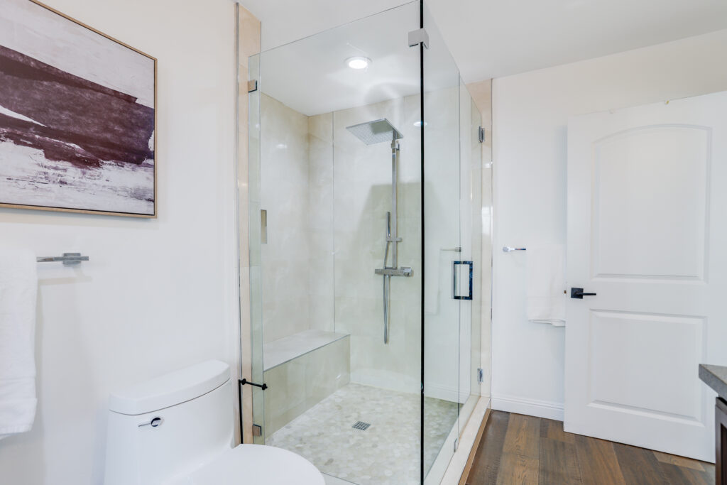 - Primary ensuite with huge glass-enclosed shower with bench, his/her sinks, custom linen cabinet, and large walk-in closet