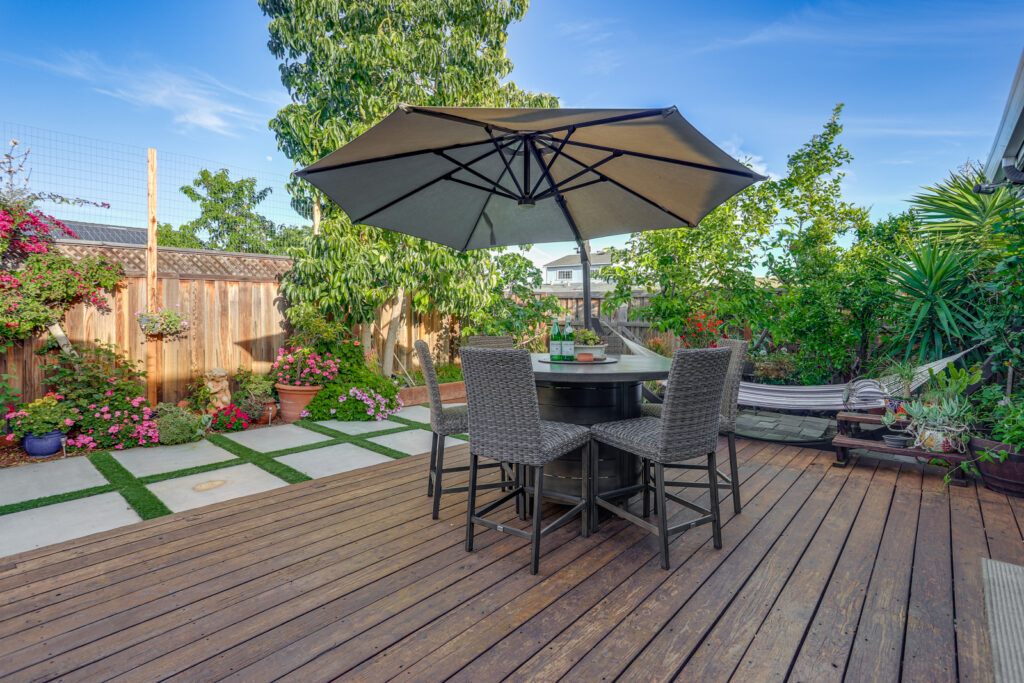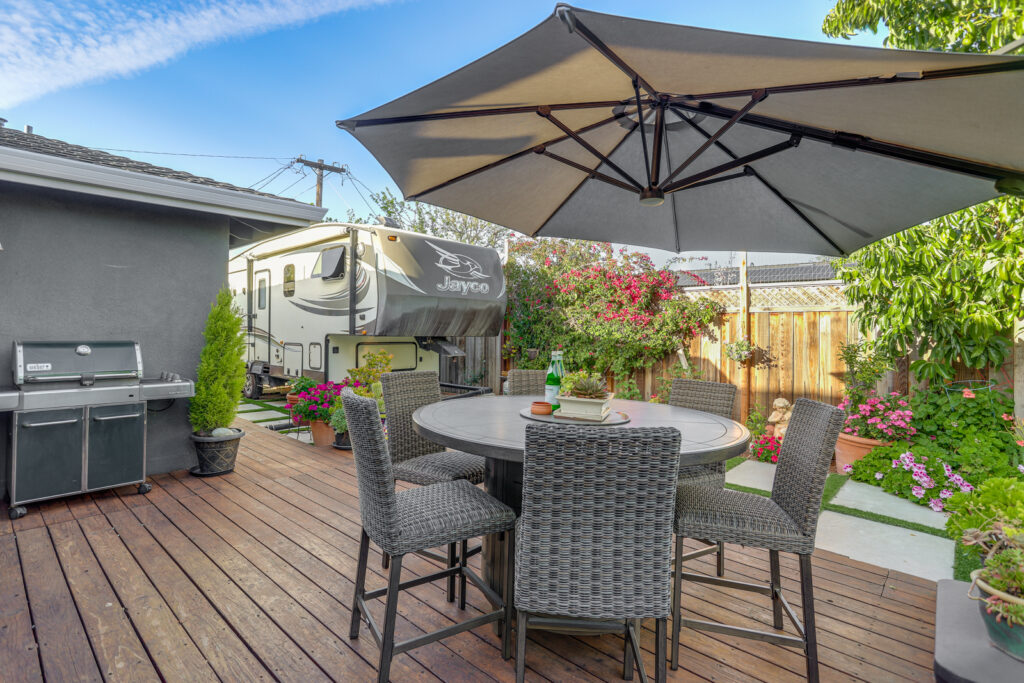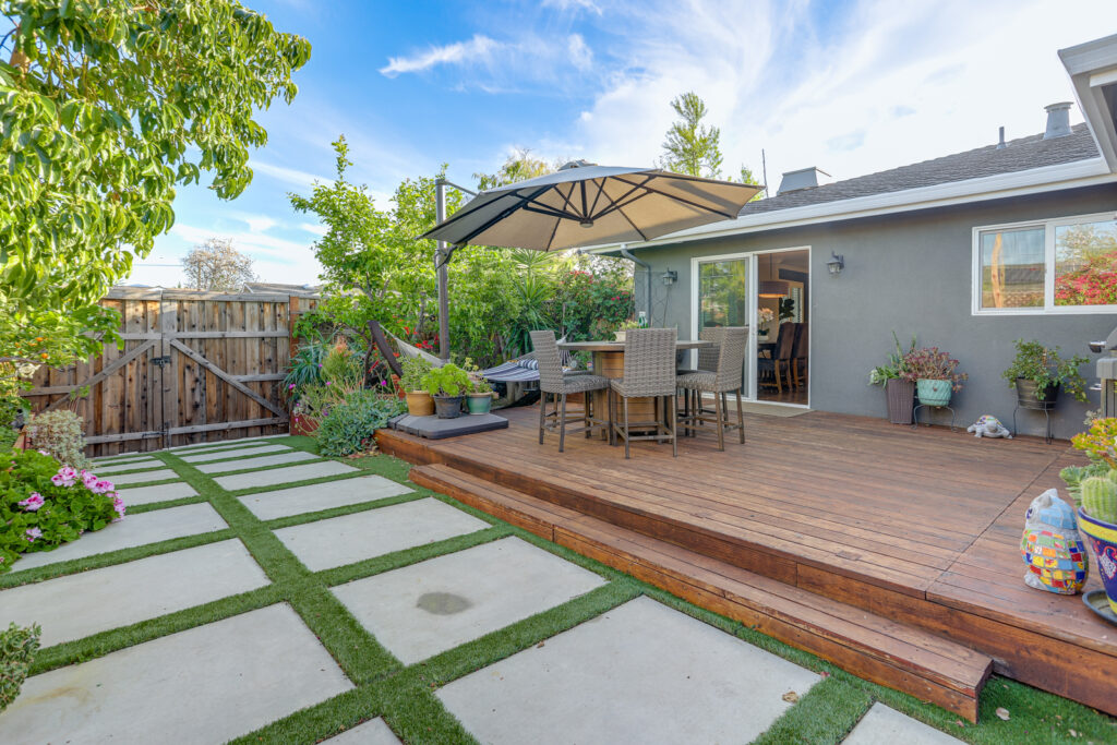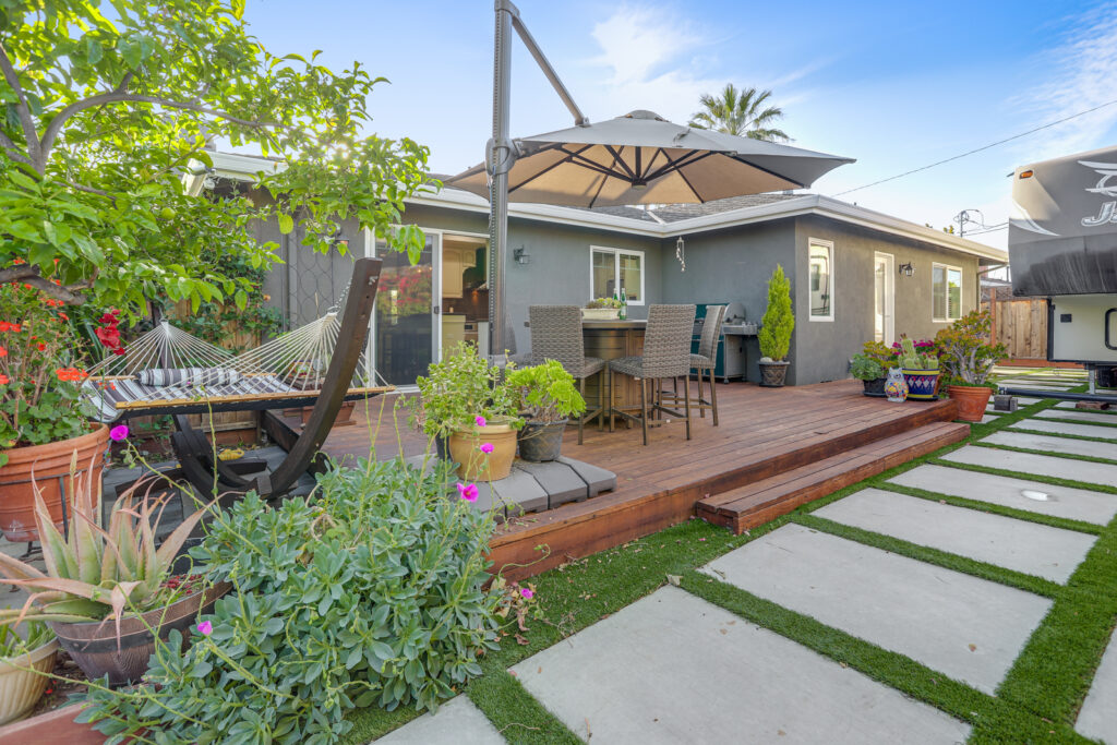- Landscaped backyard with large deck, avocado, lemon, fig, tangerine trees, and grapevine