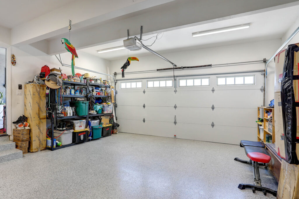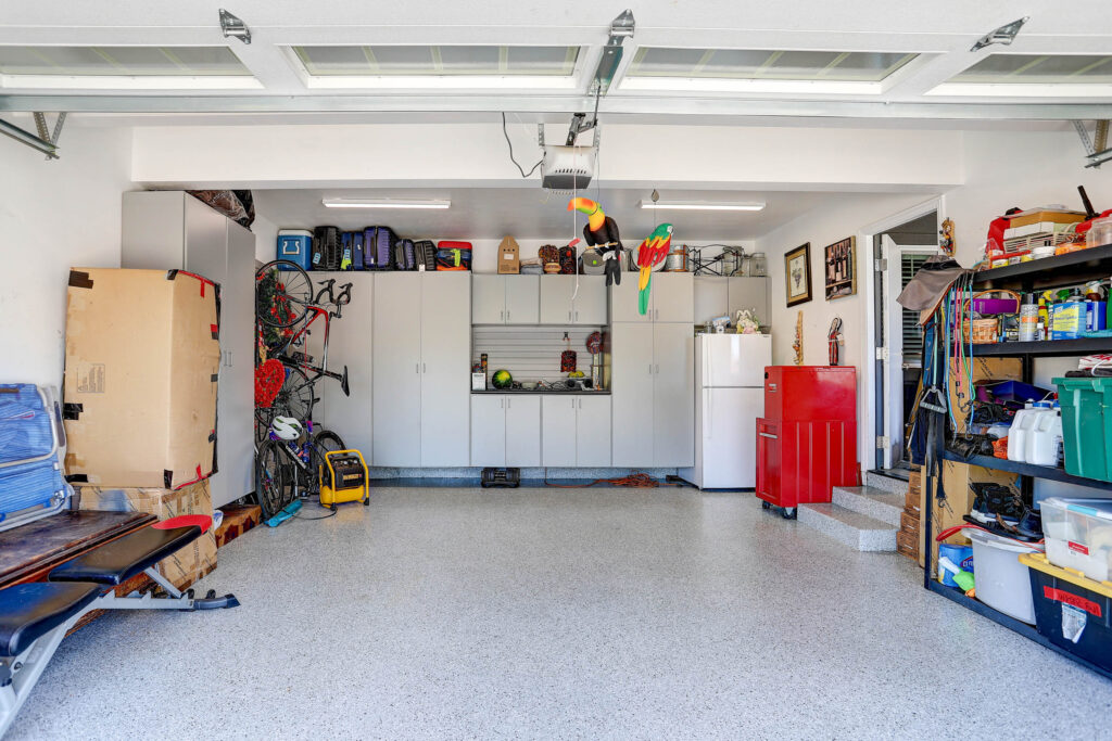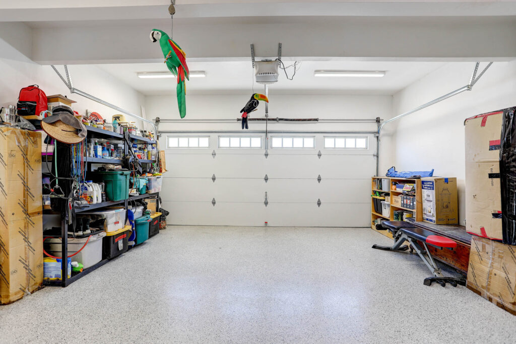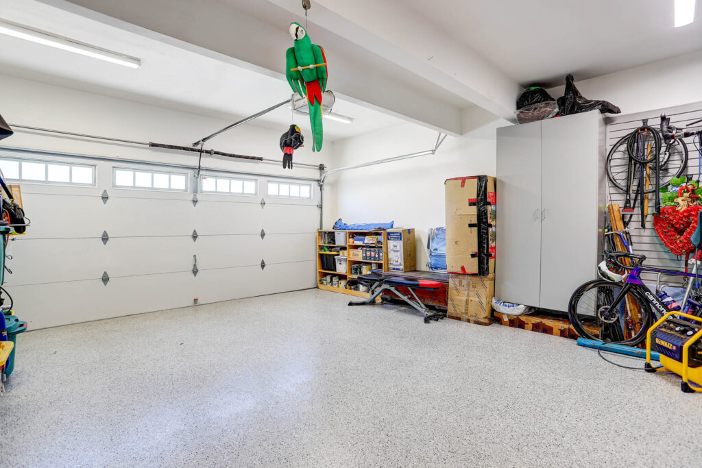 - Finished 2-car garage with epoxy flooring, built-in storage, custom cabinets