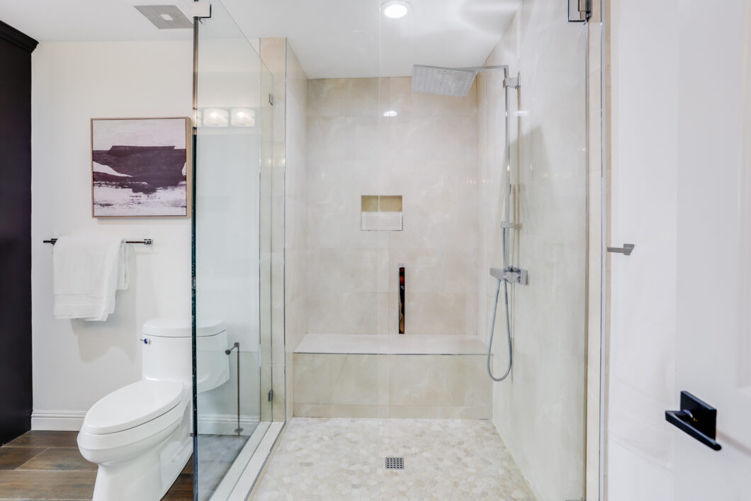 - Primary ensuite with huge glass-enclosed shower with bench, his/her sinks, custom linen cabinet, and large walk-in closet