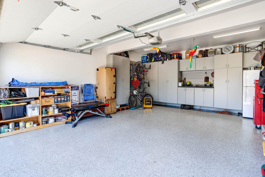 - Finished 2-car garage with epoxy flooring, built-in storage, custom cabinets
