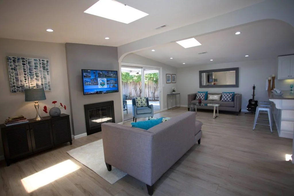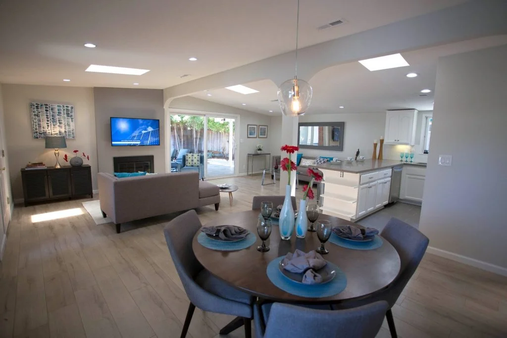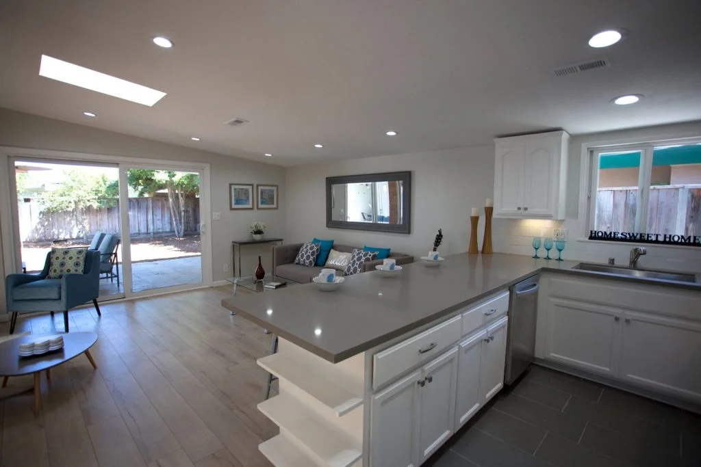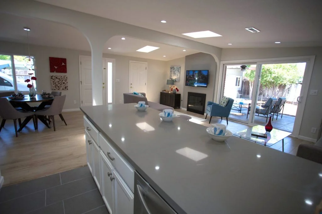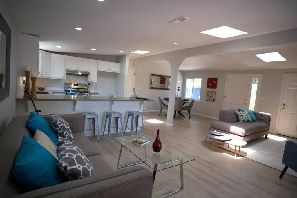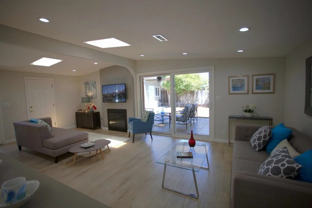 Mid-century Modern home walking distance to Sutter Elementary. This bright and beautifully updated home features an open floor plan with living room, dining room, and kitchen combined into one large living area. The kitchen features tile flooring, raised panel cabinets, cabinet pullouts, quartz slab counter tops, gas cooking, full tile backspash, and stainless steel appliances. Bathrooms feature tile floors and tiled enclosures. Private backyard with large covered slate tile patio featuring exterior lighting and fan. Other features include recessed LED lighting, TV pre-wired for power and HDMI, skylights throughout, raised panel doors, dual pane windows, central heating, spacious storage shed, and single car garage with roll up door and automatic opener.